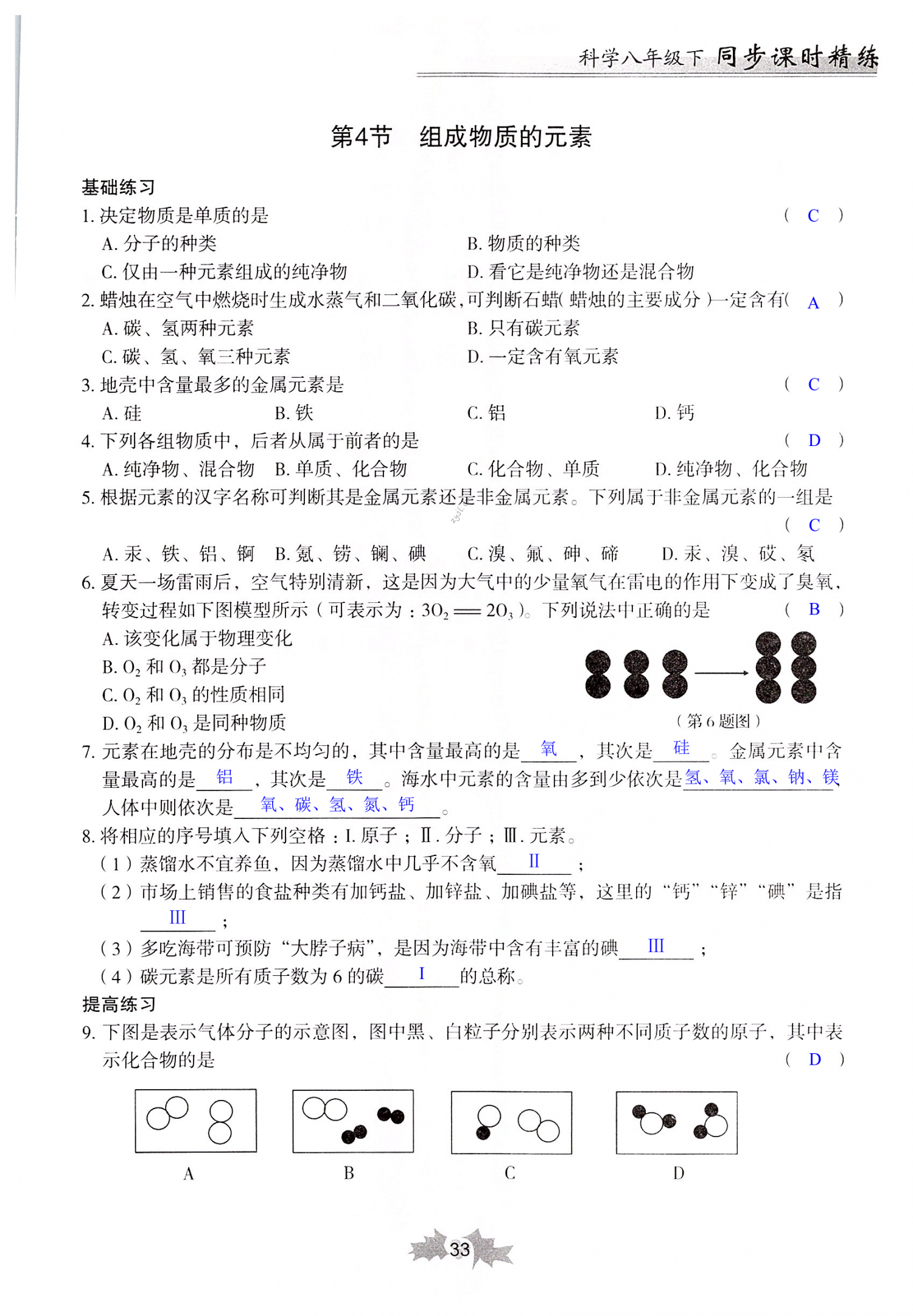 2022年同步课时精练八年级科学下册浙教版