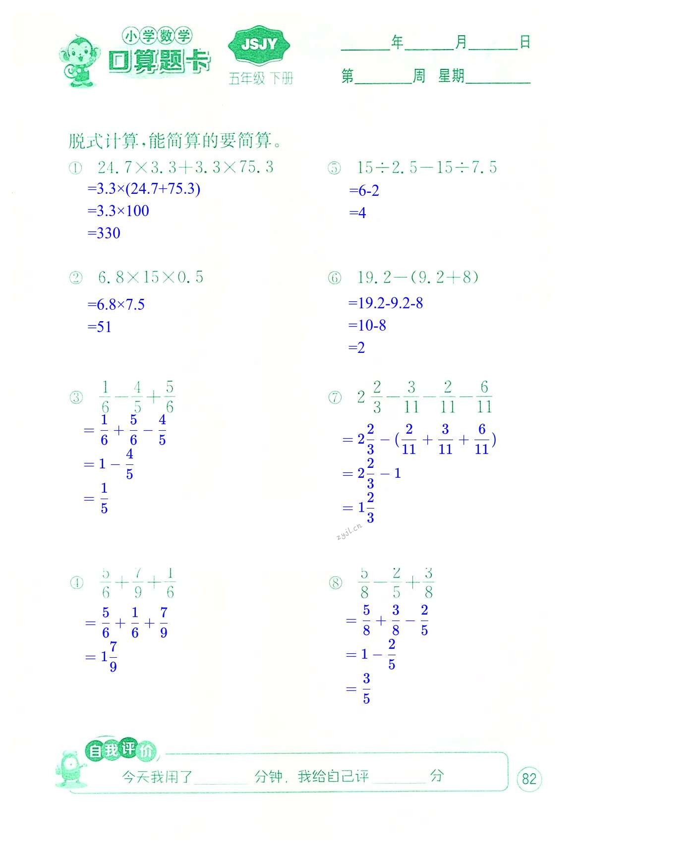 2022年小学数学口算题卡五年级下册苏教版江苏人民出版社