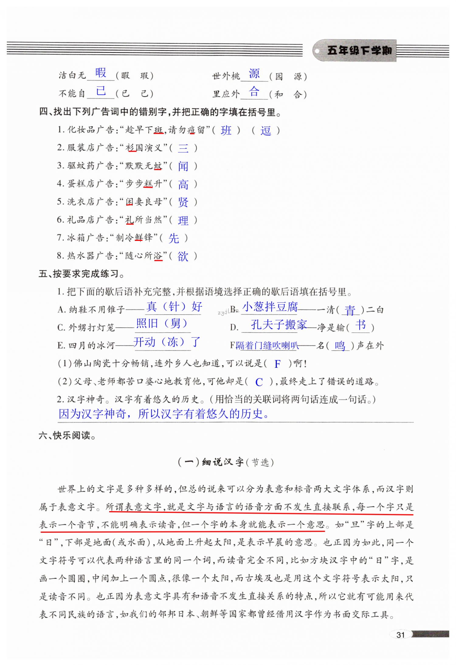 注:目前有些书本章节名称可能整理的还不是很完善,但都是按照顺序排列的,请同学们按照顺序仔细查找。练习册 2022年新课堂同步学习与探究五年级语文下册人教版金乡 答案主要是用来给同学们做完题方便对答案用的,请勿直接抄袭。