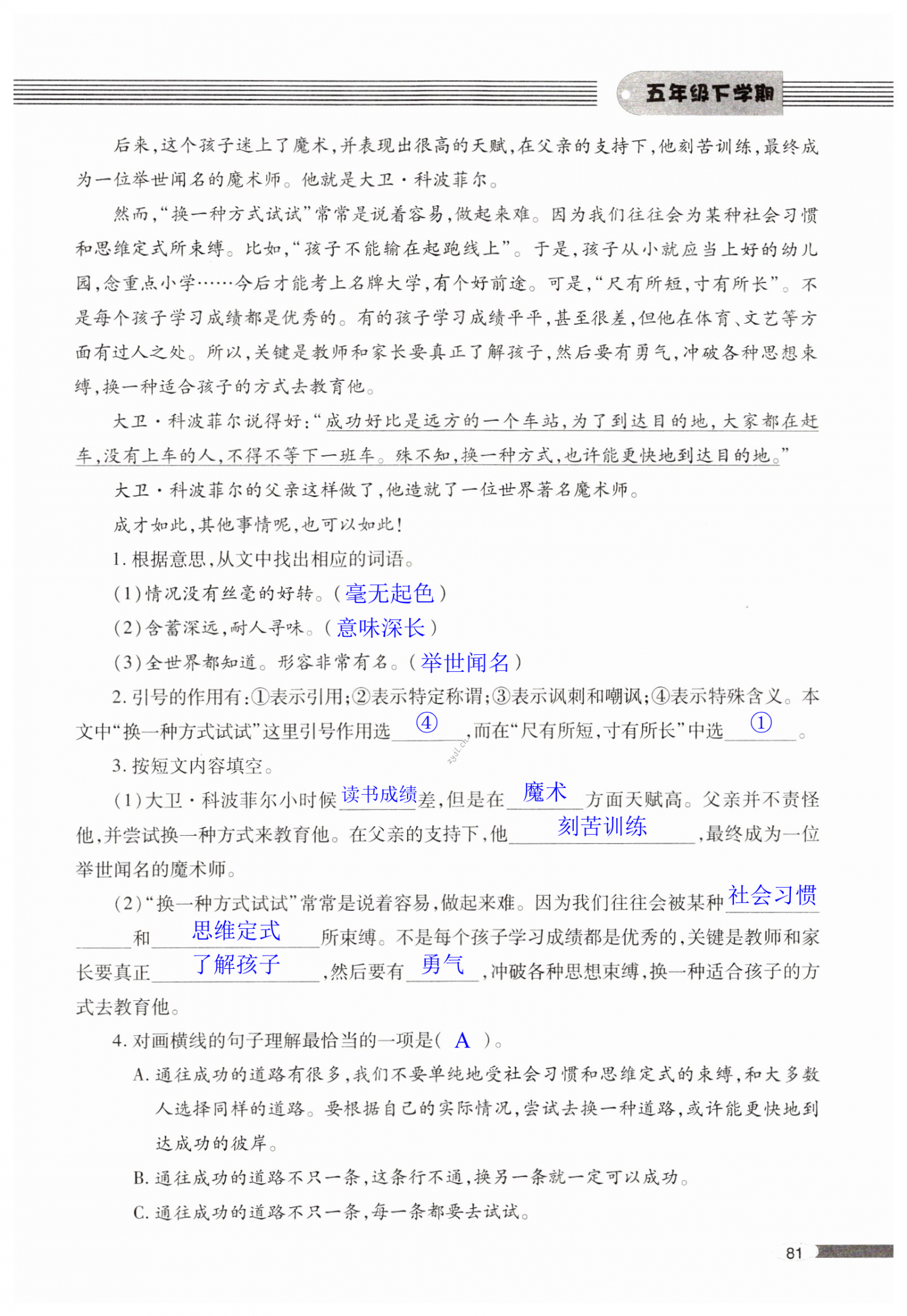 注:目前有些书本章节名称可能整理的还不是很完善,但都是按照顺序排列的,请同学们按照顺序仔细查找。练习册 2022年新课堂同步学习与探究五年级语文下册人教版金乡 答案主要是用来给同学们做完题方便对答案用的,请勿直接抄袭。