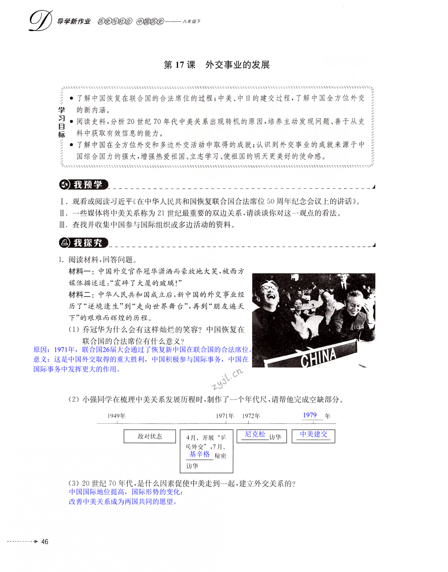 注:目前有些书本章节名称可能整理的还不是很完善,但都是按照顺序排列的,请同学们按照顺序仔细查找。练习册 2022年导学新作业八年级历史下册人教版 答案主要是用来给同学们做完题方便对答案用的,请勿直接抄袭。
