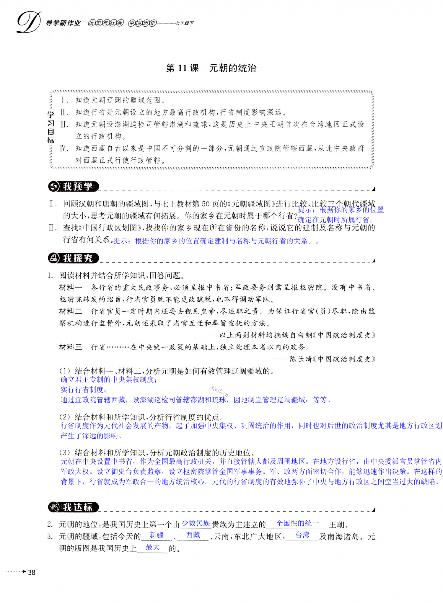 注:目前有些书本章节名称可能整理的还不是很完善,但都是按照顺序排列的,请同学们按照顺序仔细查找。练习册 2022年导学新作业七年级历史下册人教版 答案主要是用来给同学们做完题方便对答案用的,请勿直接抄袭。