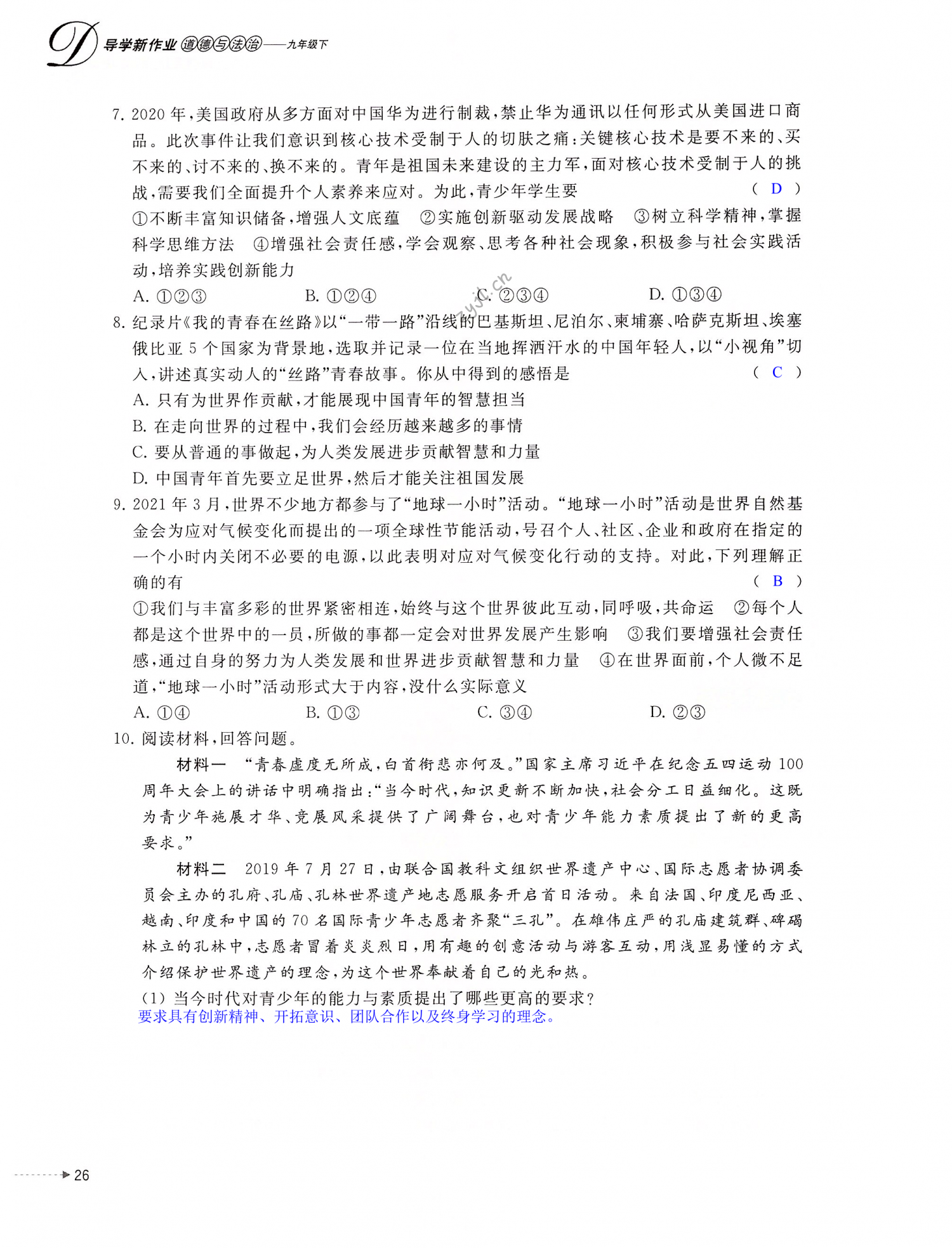 注:目前有些书本章节名称可能整理的还不是很完善,但都是按照顺序排列的,请同学们按照顺序仔细查找。练习册 2022年导学新作业九年级道德与法治下册人教版 答案主要是用来给同学们做完题方便对答案用的,请勿直接抄袭。