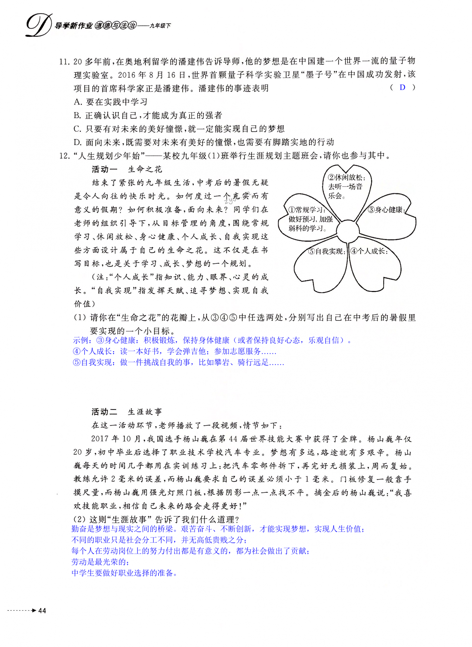 注:目前有些书本章节名称可能整理的还不是很完善,但都是按照顺序排列的,请同学们按照顺序仔细查找。练习册 2022年导学新作业九年级道德与法治下册人教版 答案主要是用来给同学们做完题方便对答案用的,请勿直接抄袭。