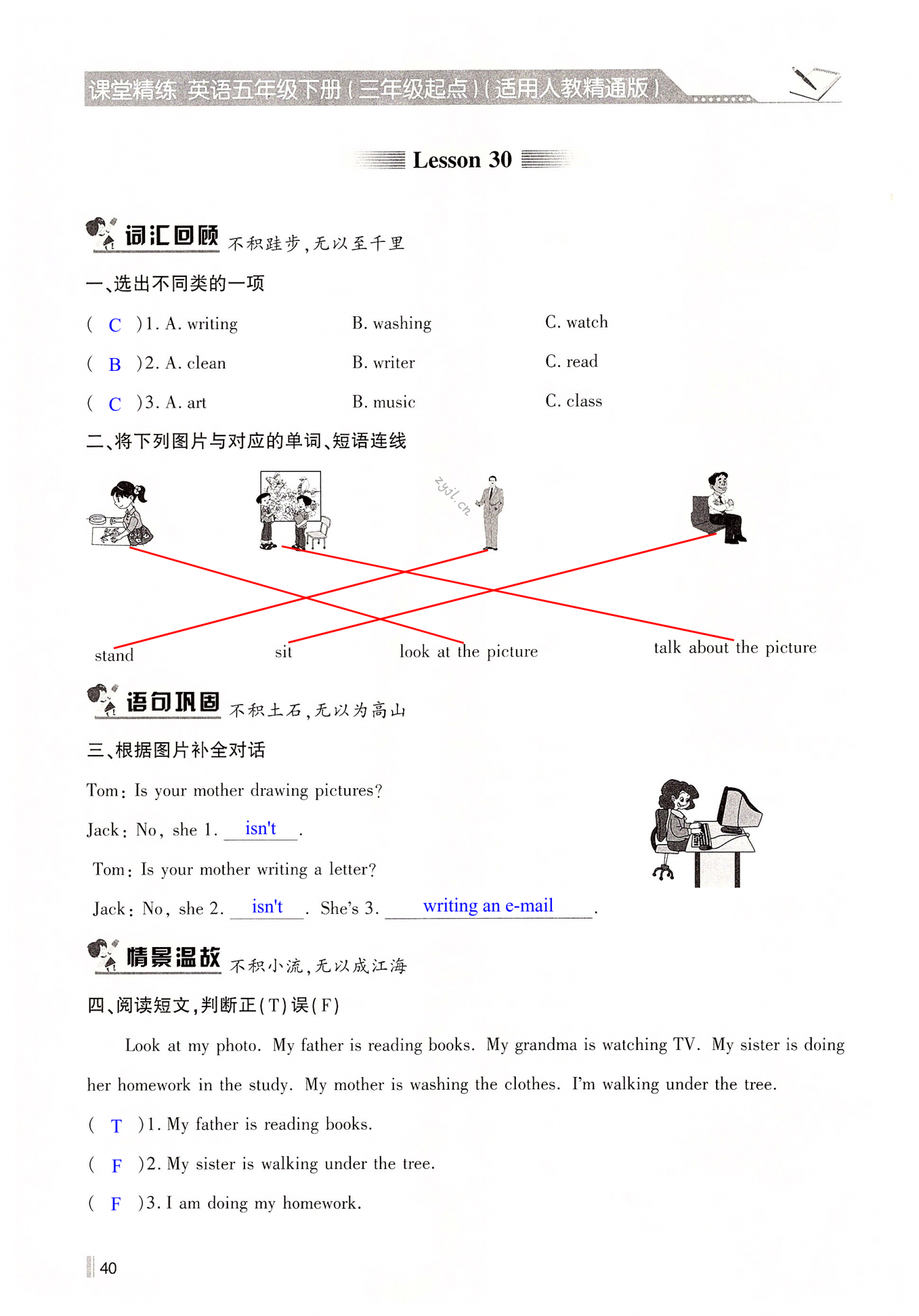 注:目前有些书本章节名称可能整理的还不是很完善,但都是按照顺序排列的,请同学们按照顺序仔细查找。练习册 2022年课堂精练五年级英语下册人教精通版 答案主要是用来给同学们做完题方便对答案用的,请勿直接抄袭。