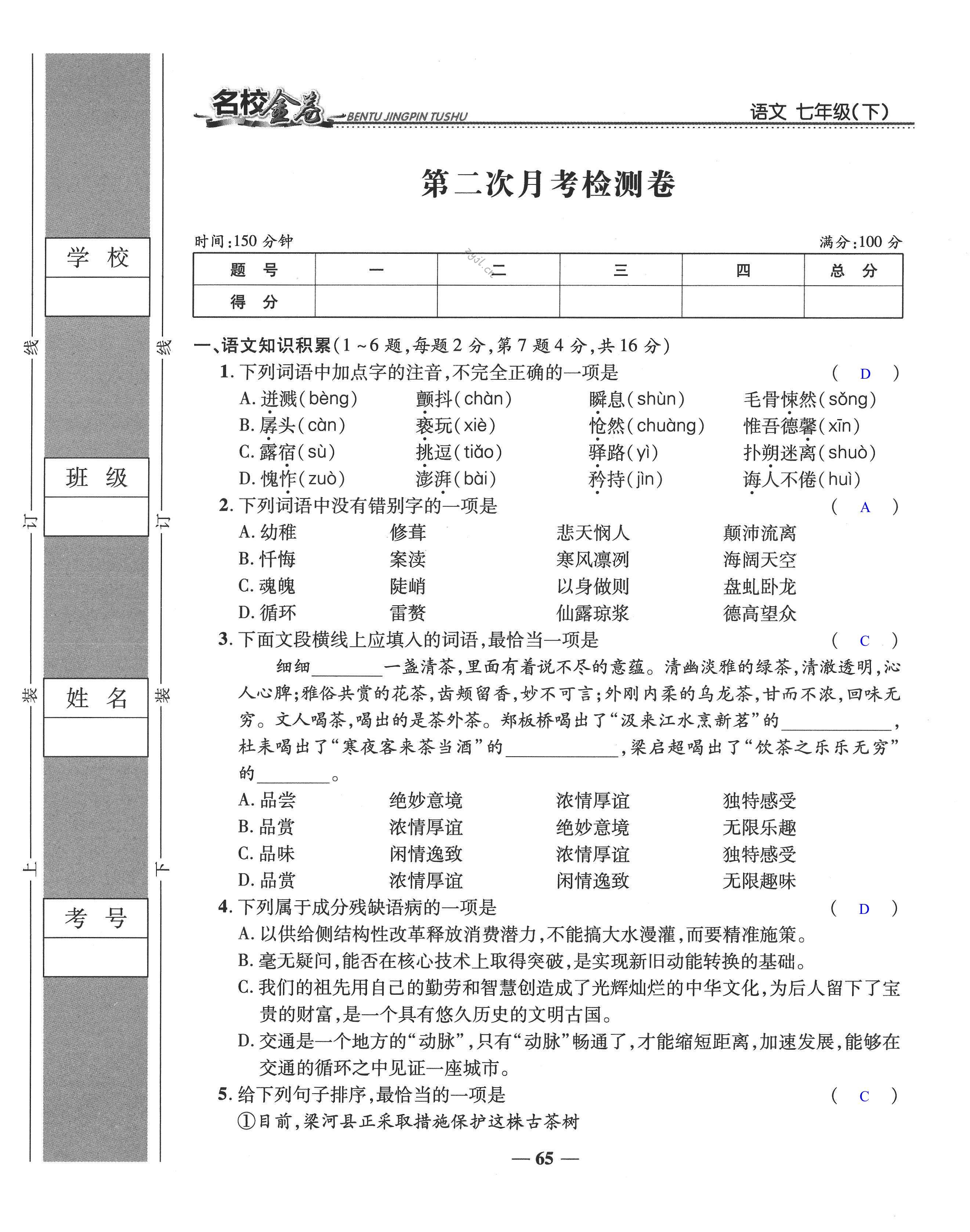 注:目前有些书本章节名称可能整理的还不是很完善,但都是按照顺序排列的,请同学们按照顺序仔细查找。练习册 2022年云南本土名校金卷七年级语文下册人教版 答案主要是用来给同学们做完题方便对答案用的,请勿直接抄袭。