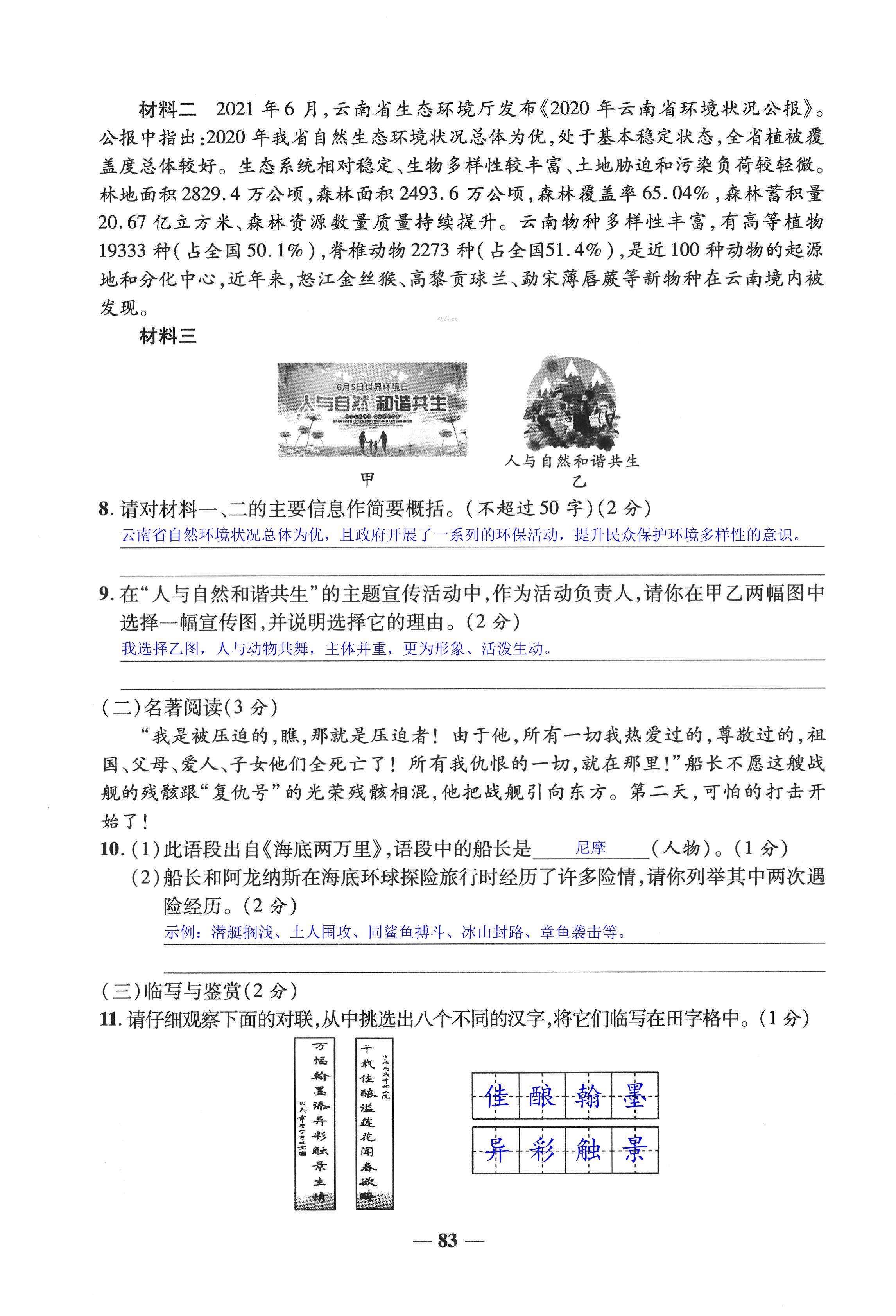 注:目前有些书本章节名称可能整理的还不是很完善,但都是按照顺序排列的,请同学们按照顺序仔细查找。练习册 2022年云南本土名校金卷七年级语文下册人教版 答案主要是用来给同学们做完题方便对答案用的,请勿直接抄袭。