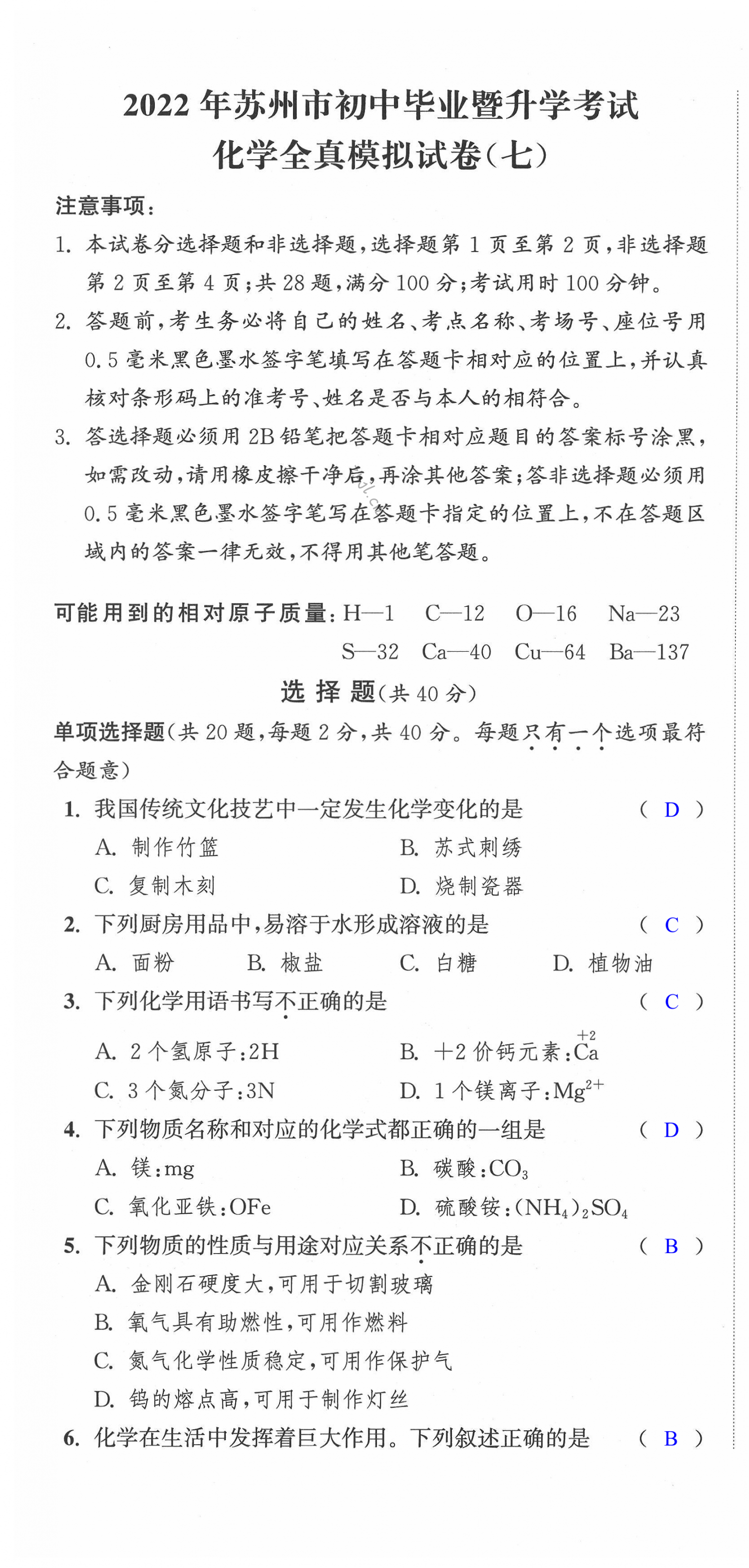 注:目前有些书本章节名称可能整理的还不是很完善,但都是按照顺序排列的,请同学们按照顺序仔细查找。练习册 2022年突击中考中考全真模拟总复习化学苏州专版 答案主要是用来给同学们做完题方便对答案用的,请勿直接抄袭。