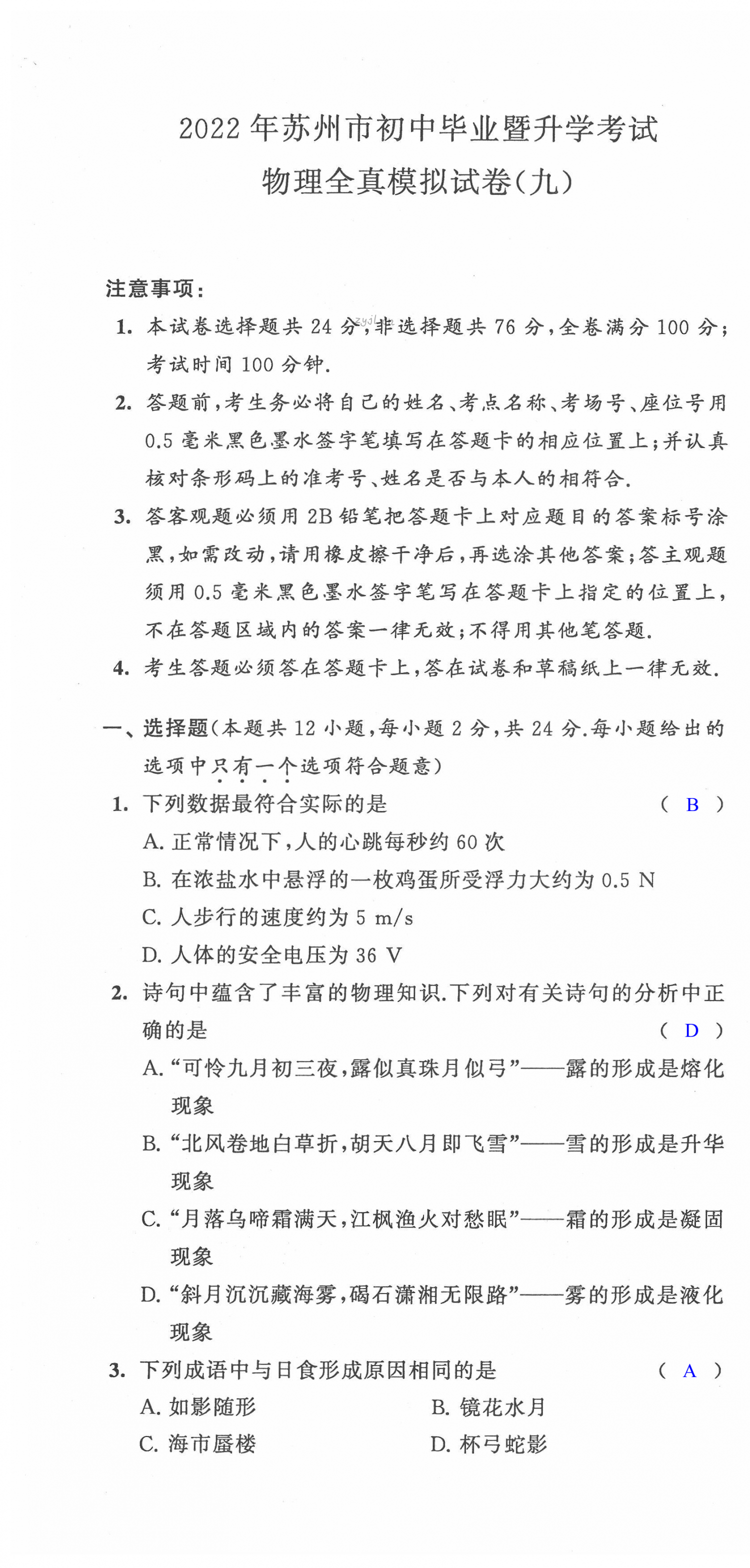 2022年突击中考中考全真模拟总复习物理苏州专版