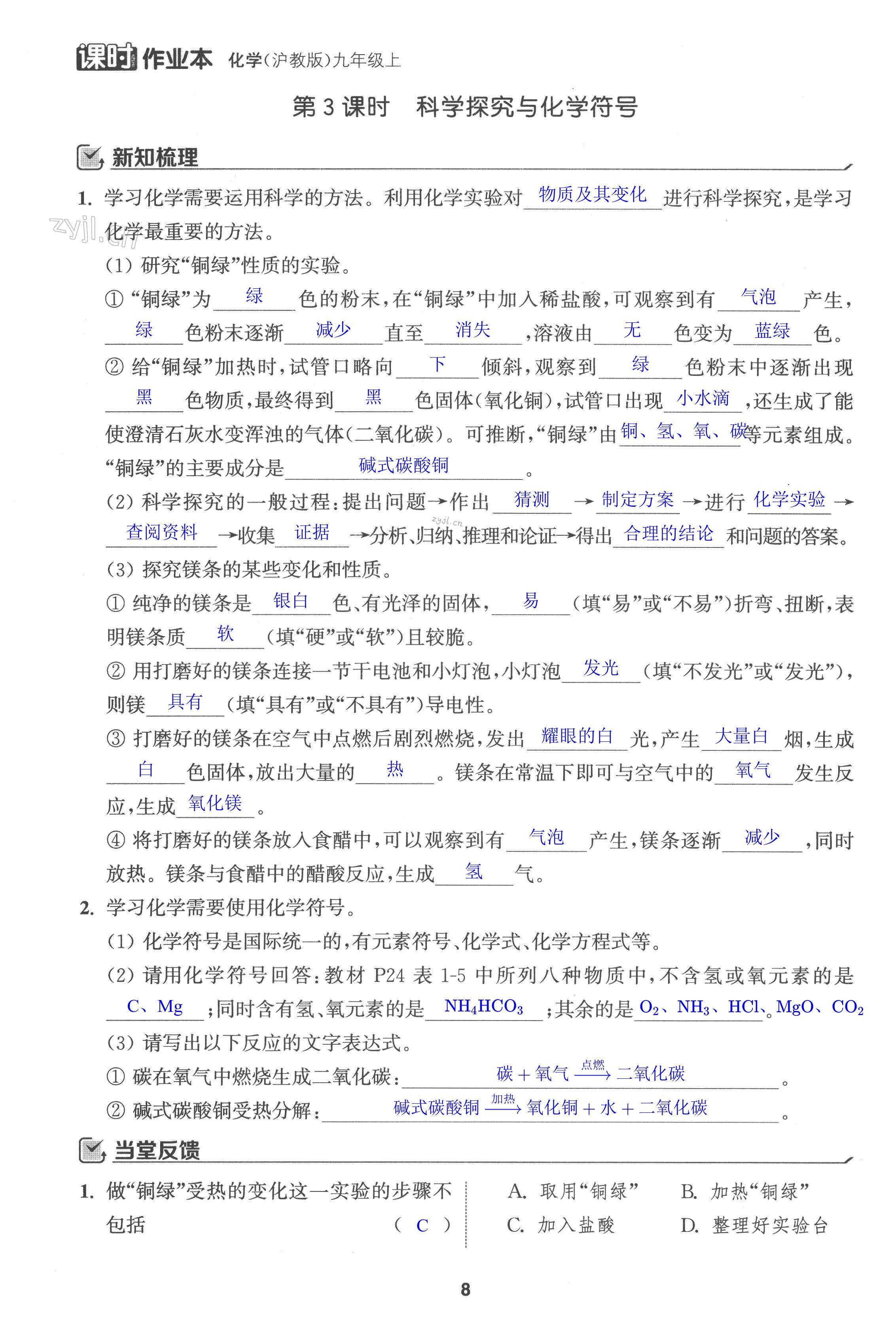 注:目前有些书本章节名称可能整理的还不是很完善,但都是按照顺序排列的,请同学们按照顺序仔细查找。练习册 2022年通城学典课时作业本九年级化学上册沪教版 答案主要是用来给同学们做完题方便对答案用的,请勿直接抄袭。