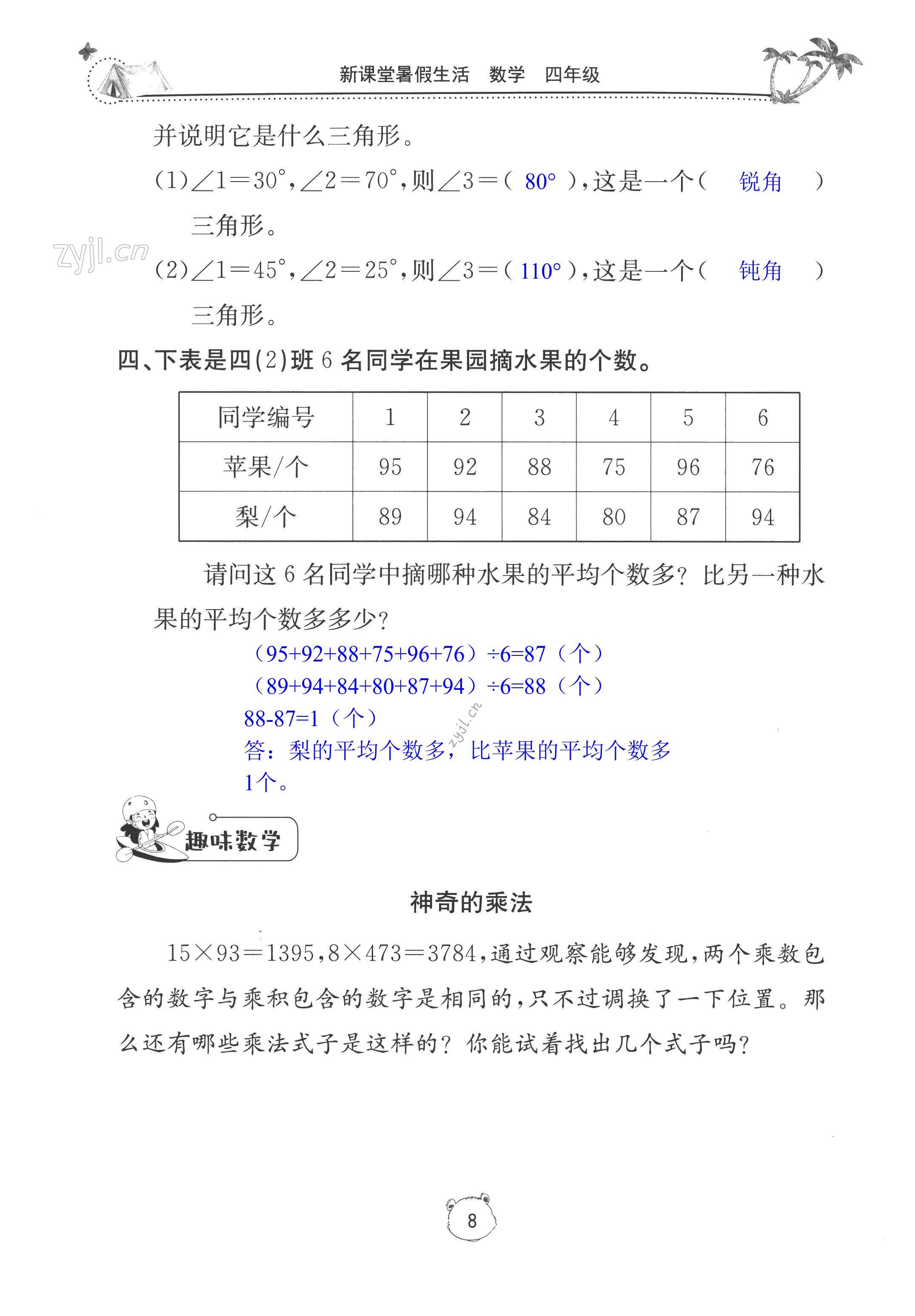 注:目前有些书本章节名称可能整理的还不是很完善,但都是按照顺序排列的,请同学们按照顺序仔细查找。练习册 2022年新课堂暑假生活四年级数学 答案主要是用来给同学们做完题方便对答案用的,请勿直接抄袭。