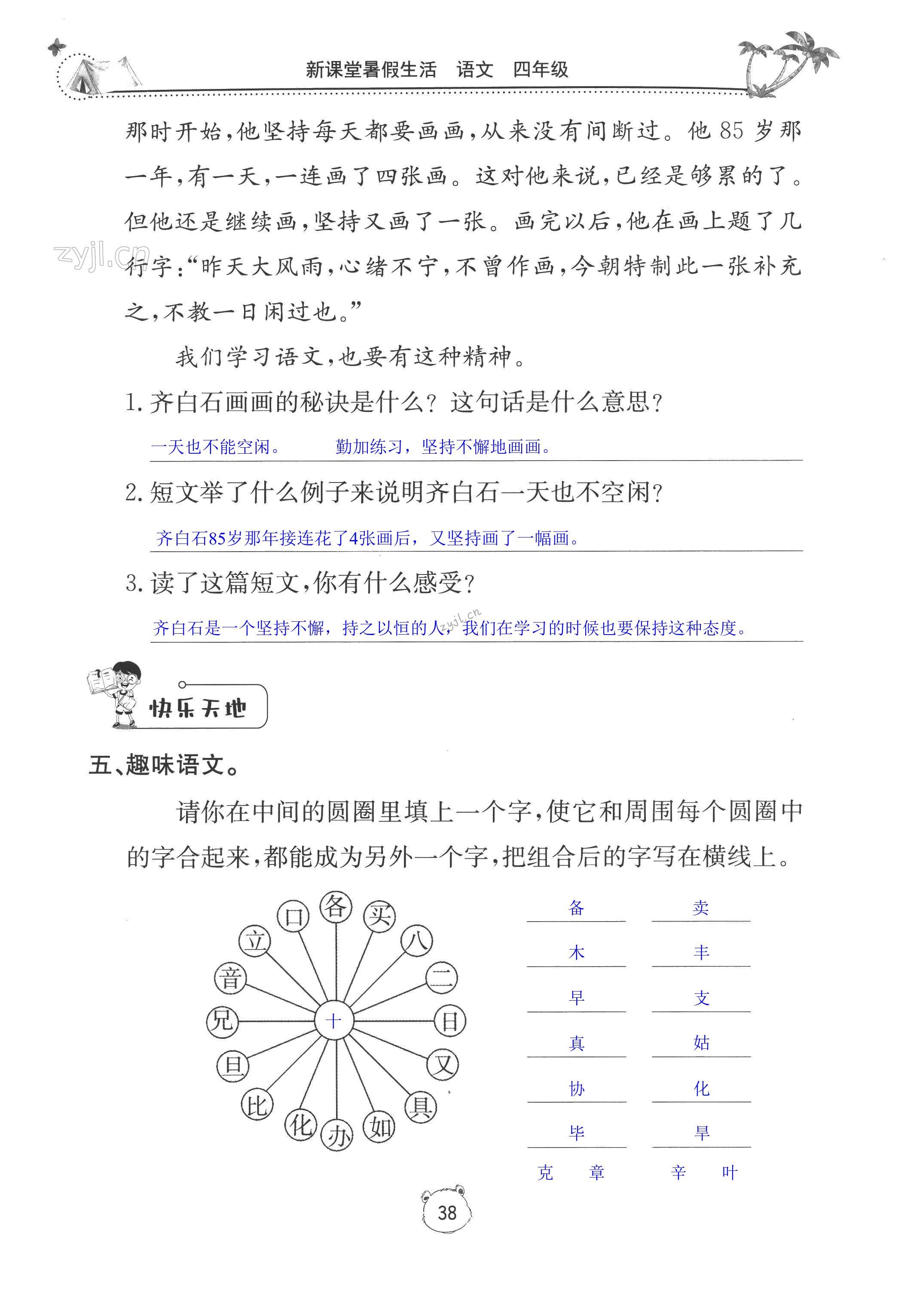 注:目前有些书本章节名称可能整理的还不是很完善,但都是按照顺序排列的,请同学们按照顺序仔细查找。练习册 2022年新课堂暑假生活四年级语文 答案主要是用来给同学们做完题方便对答案用的,请勿直接抄袭。
