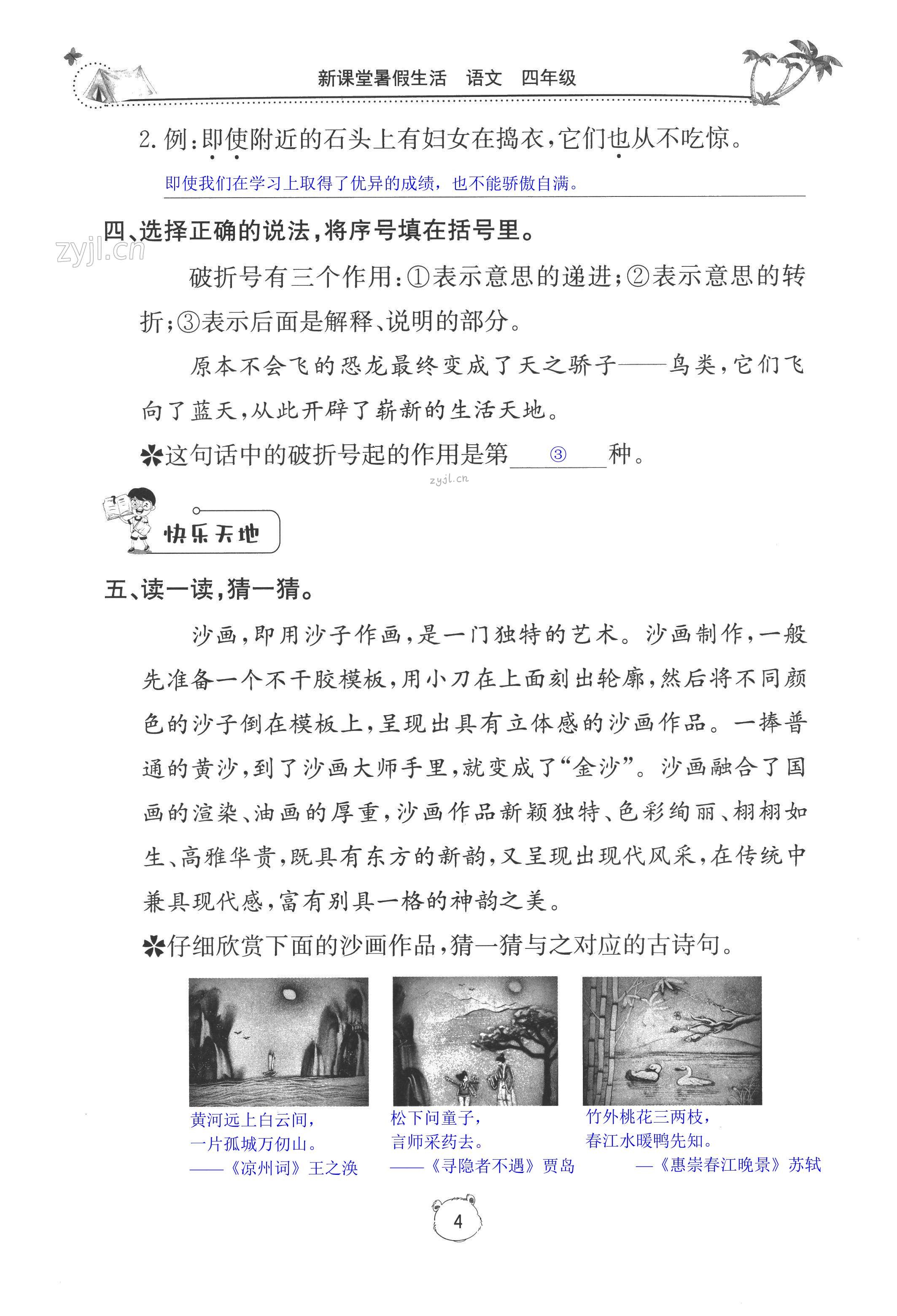 注:目前有些书本章节名称可能整理的还不是很完善,但都是按照顺序排列的,请同学们按照顺序仔细查找。练习册 2022年新课堂暑假生活四年级语文 答案主要是用来给同学们做完题方便对答案用的,请勿直接抄袭。