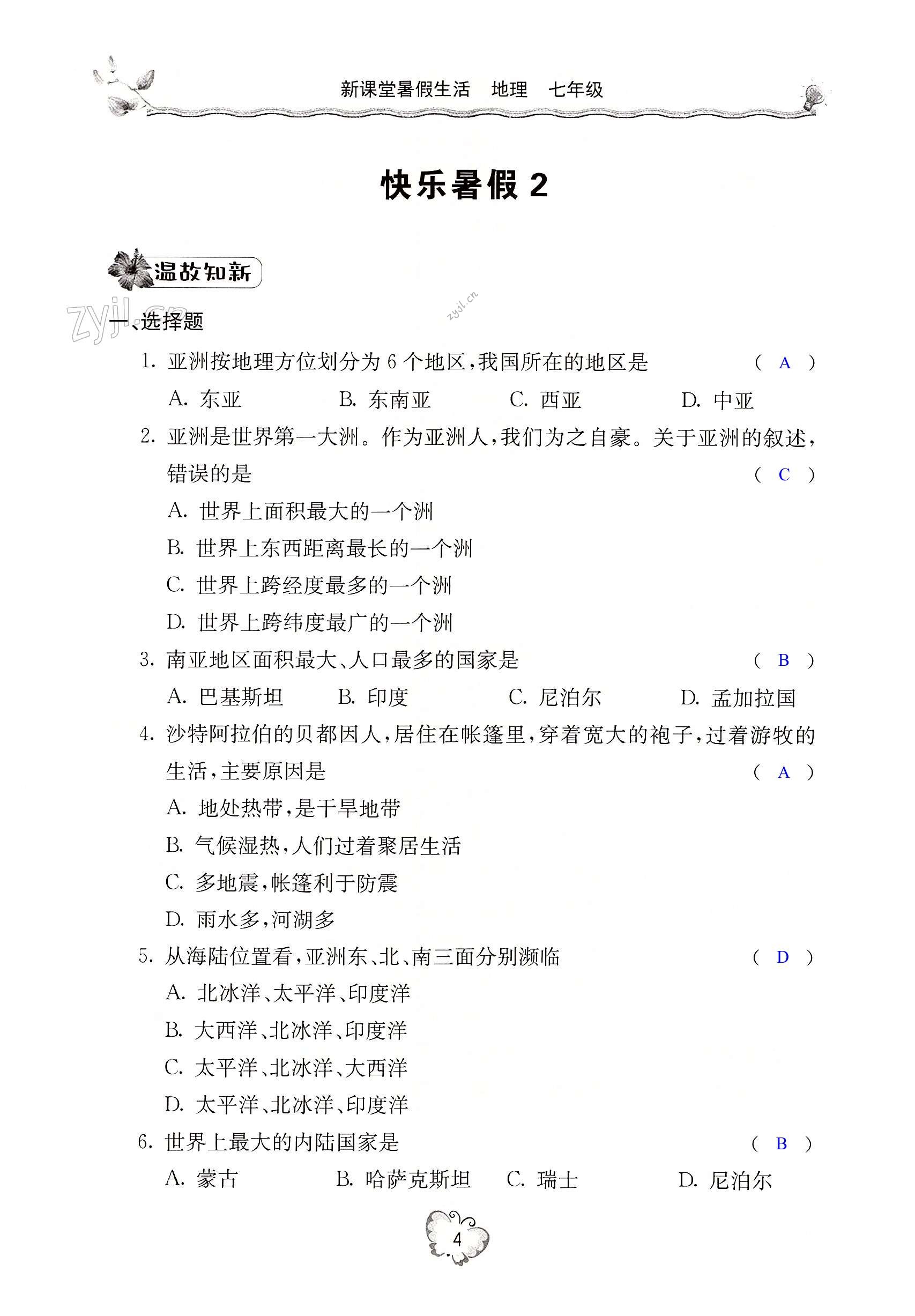 注:目前有些书本章节名称可能整理的还不是很完善,但都是按照顺序排列的,请同学们按照顺序仔细查找。练习册 2022年新课堂暑假生活七年级地理 答案主要是用来给同学们做完题方便对答案用的,请勿直接抄袭。