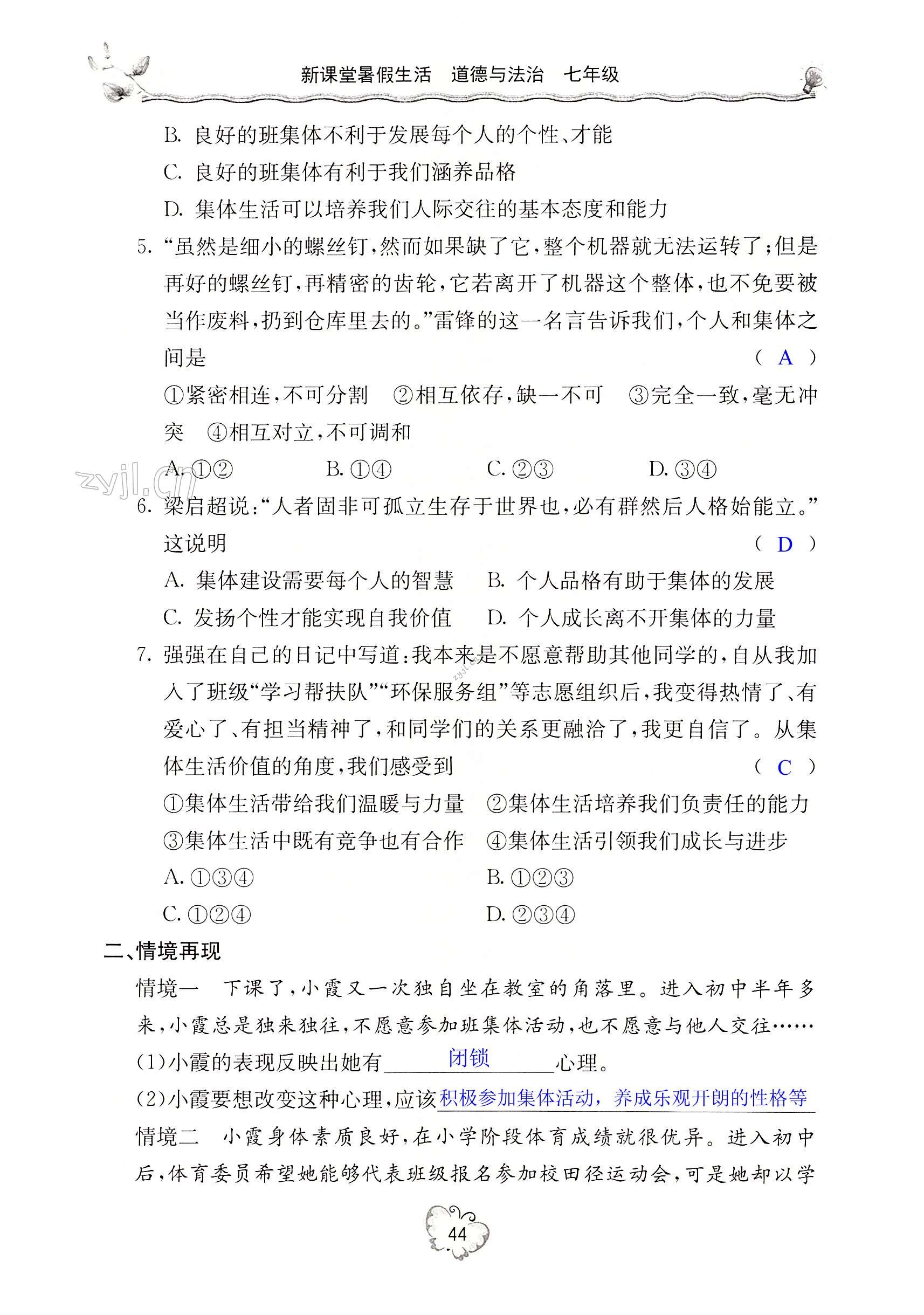注:目前有些书本章节名称可能整理的还不是很完善,但都是按照顺序排列的,请同学们按照顺序仔细查找。练习册 2022年新课堂暑假生活七年级道德与法治 答案主要是用来给同学们做完题方便对答案用的,请勿直接抄袭。