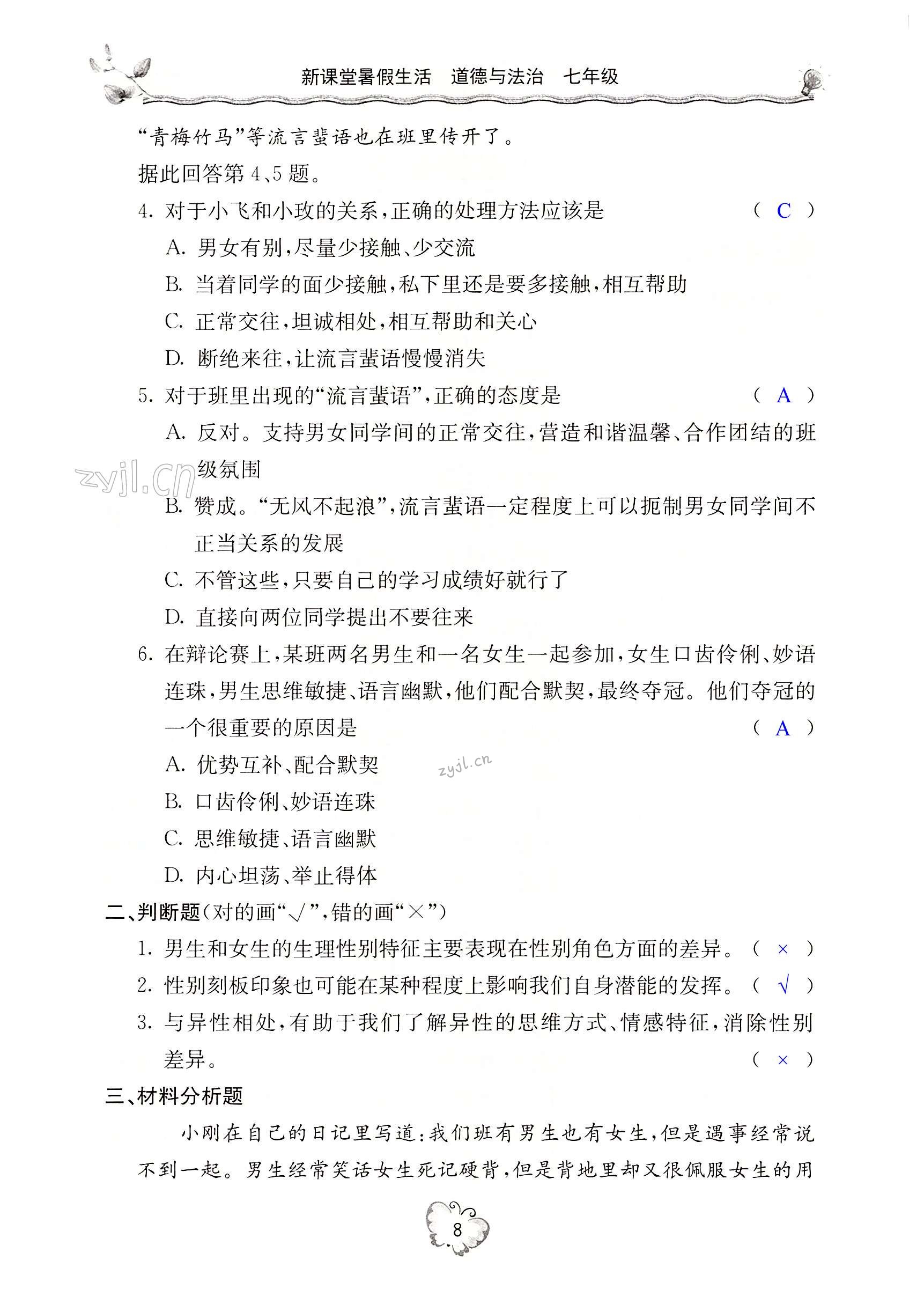 注:目前有些书本章节名称可能整理的还不是很完善,但都是按照顺序排列的,请同学们按照顺序仔细查找。练习册 2022年新课堂暑假生活七年级道德与法治 答案主要是用来给同学们做完题方便对答案用的,请勿直接抄袭。