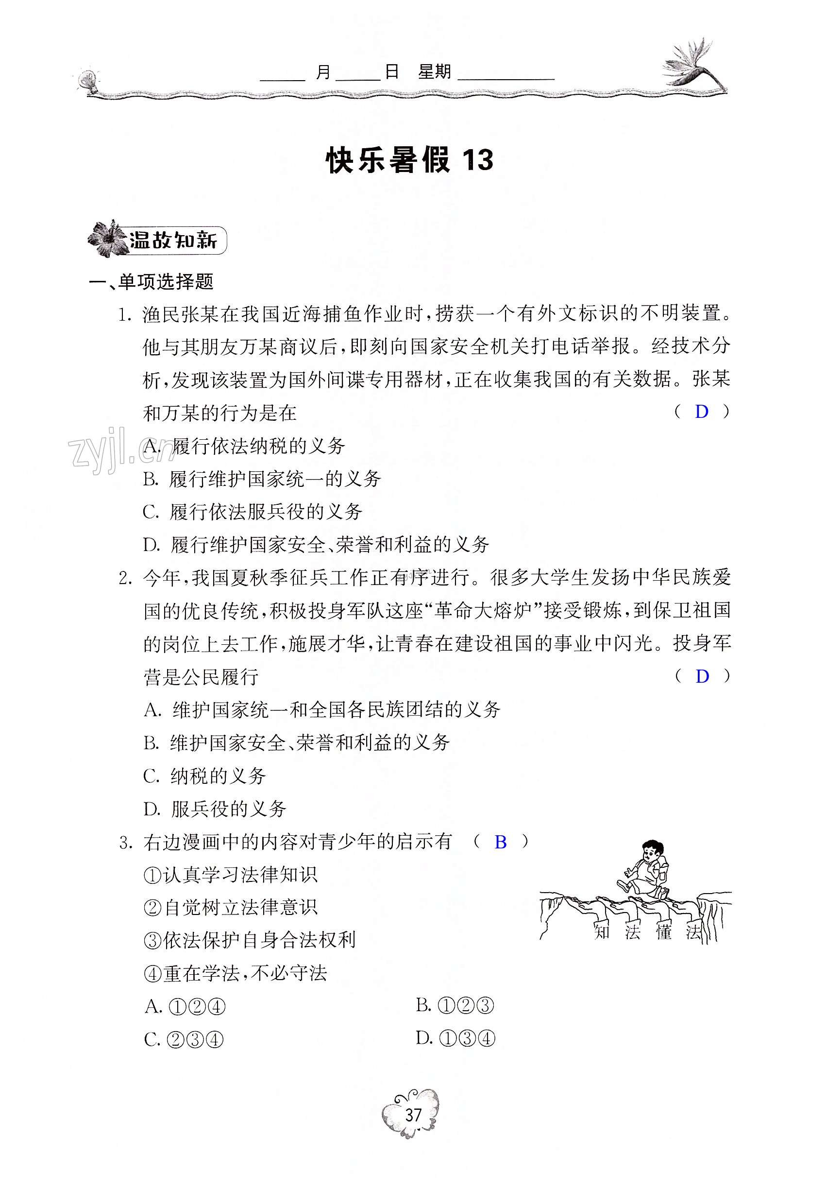 注:目前有些书本章节名称可能整理的还不是很完善,但都是按照顺序排列的,请同学们按照顺序仔细查找。练习册 2022年新课堂暑假生活八年级道德与法治 答案主要是用来给同学们做完题方便对答案用的,请勿直接抄袭。