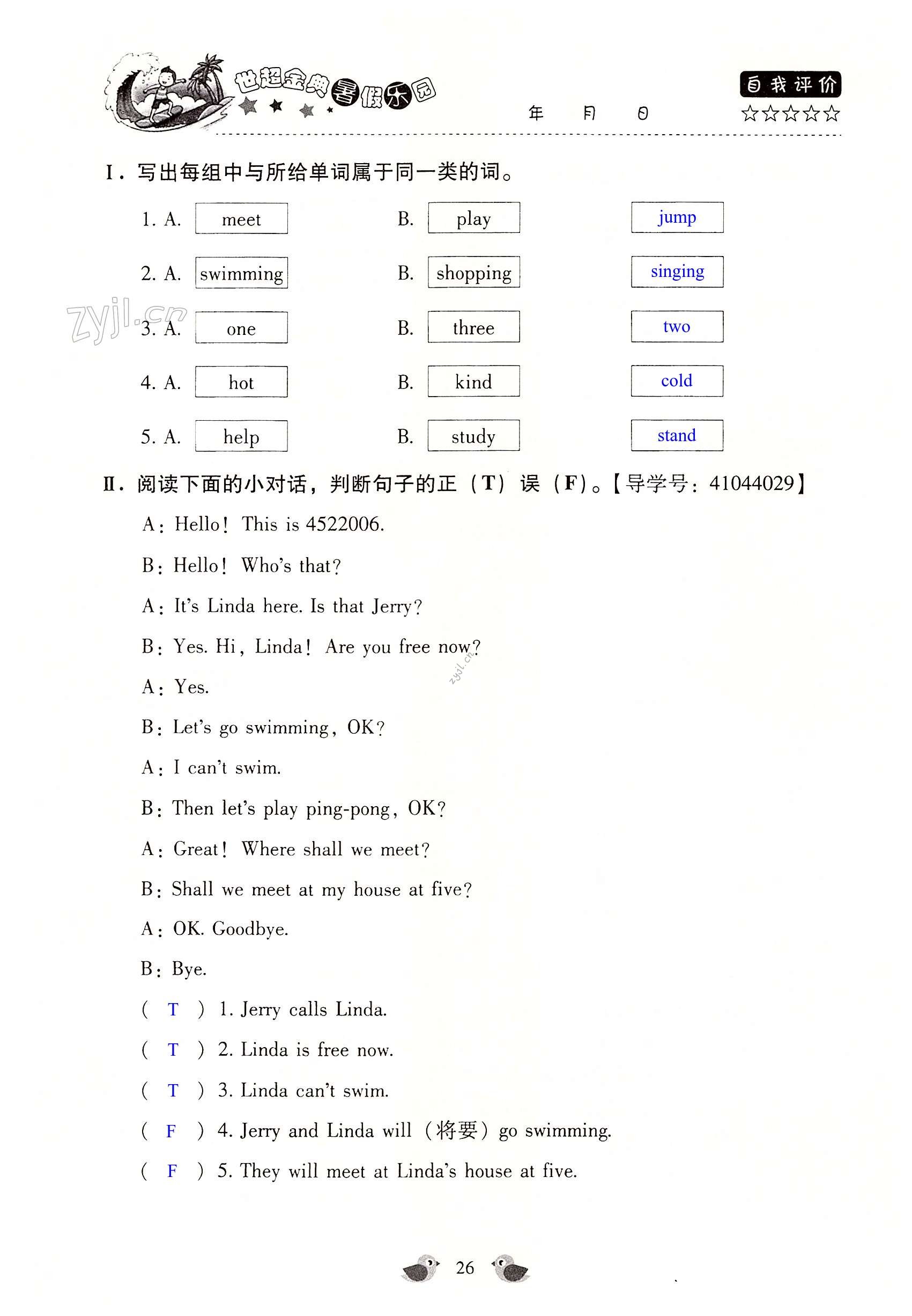注:目前有些书本章节名称可能整理的还不是很完善,但都是按照顺序排列的,请同学们按照顺序仔细查找。练习册 2022年世超金典暑假乐园四年级英语科普版 答案主要是用来给同学们做完题方便对答案用的,请勿直接抄袭。