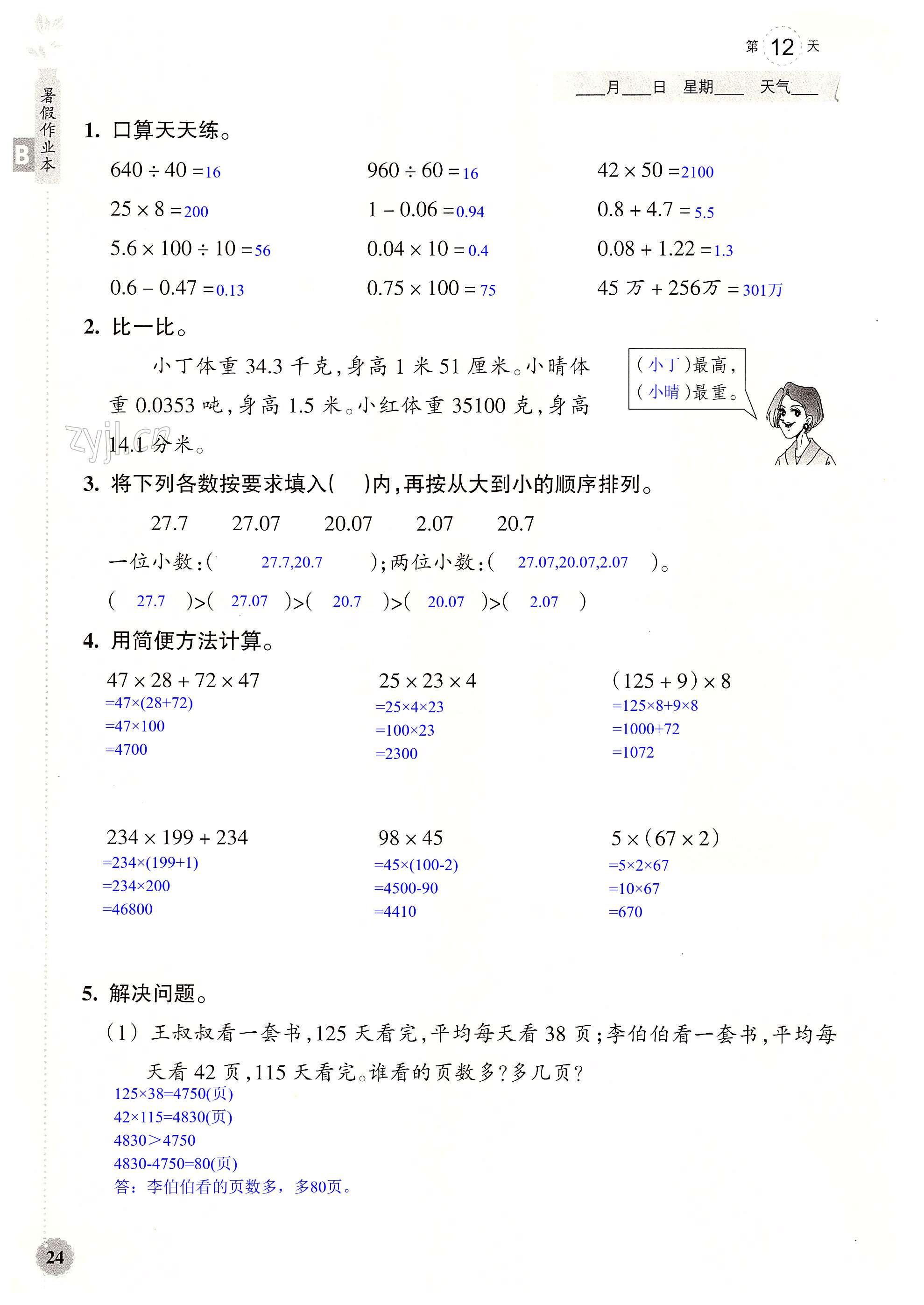 注:目前有些书本章节名称可能整理的还不是很完善,但都是按照顺序排列的,请同学们按照顺序仔细查找。练习册 2022年暑假作业本四年级数学B科学浙江教育出版社 答案主要是用来给同学们做完题方便对答案用的,请勿直接抄袭。