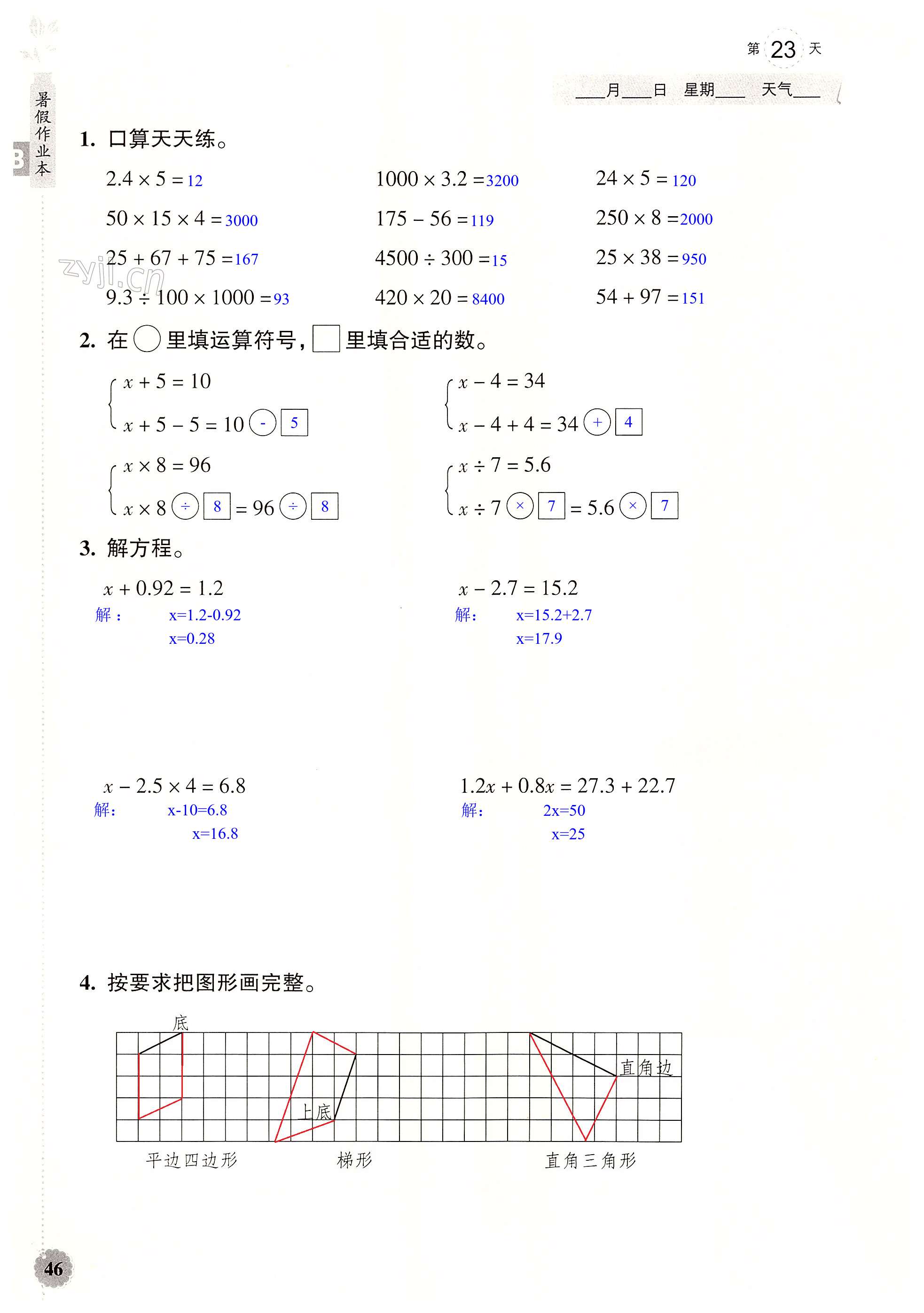 注:目前有些书本章节名称可能整理的还不是很完善,但都是按照顺序排列的,请同学们按照顺序仔细查找。练习册 2022年暑假作业本四年级数学B科学浙江教育出版社 答案主要是用来给同学们做完题方便对答案用的,请勿直接抄袭。
