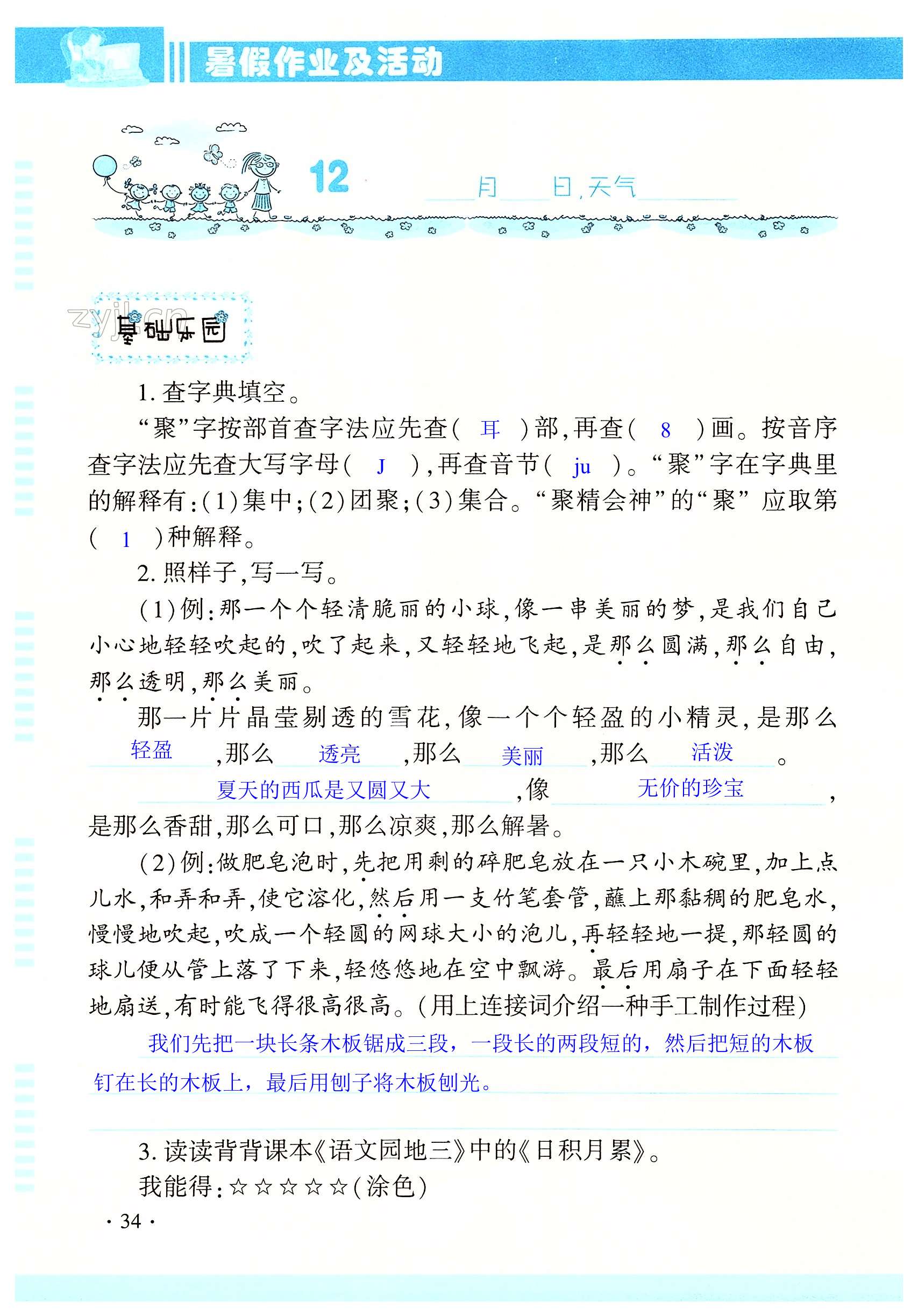 2022年暑假作业及活动三年级语文新疆文化出版社