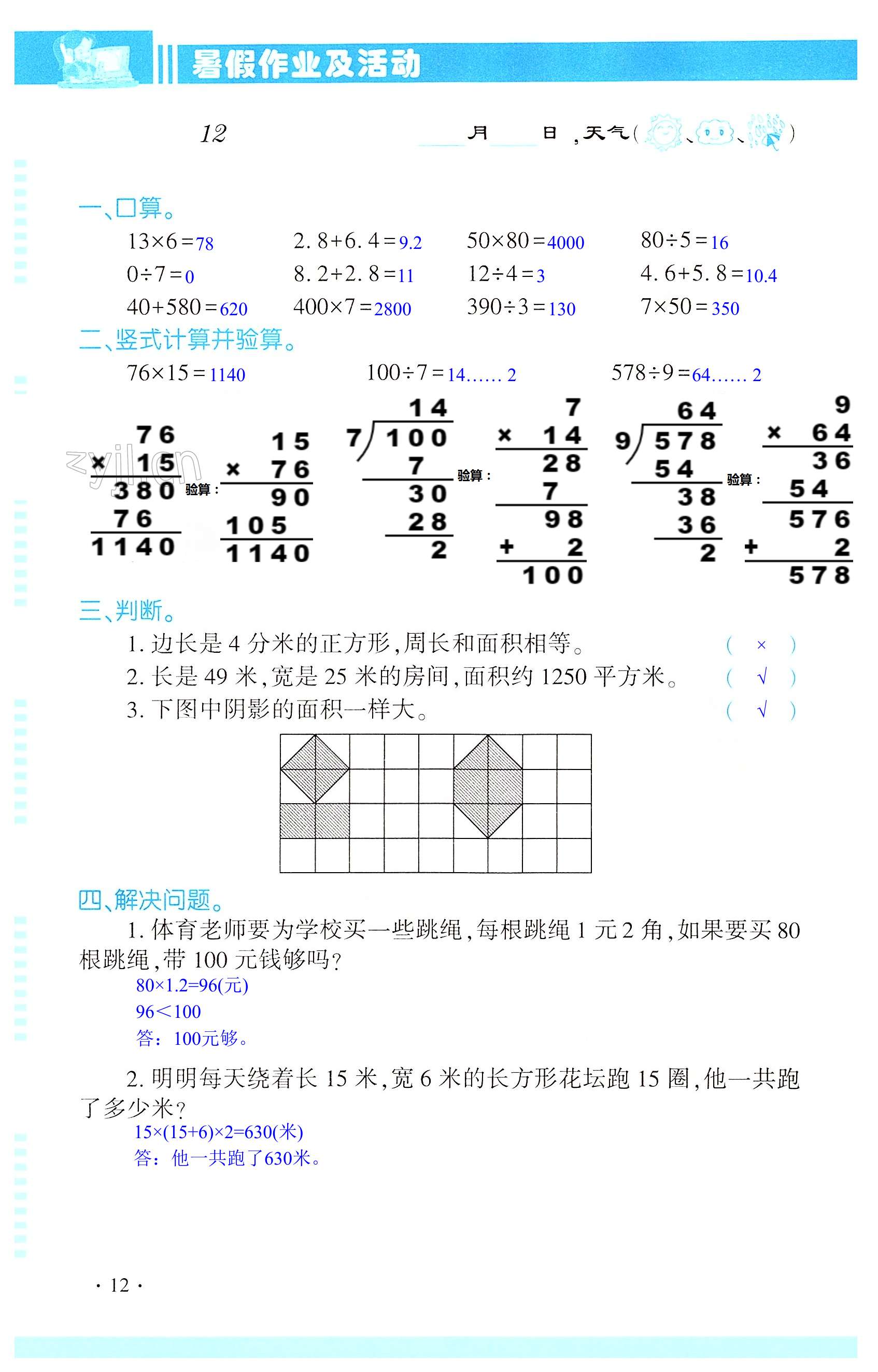2022年暑假作业及活动三年级数学新疆文化出版社