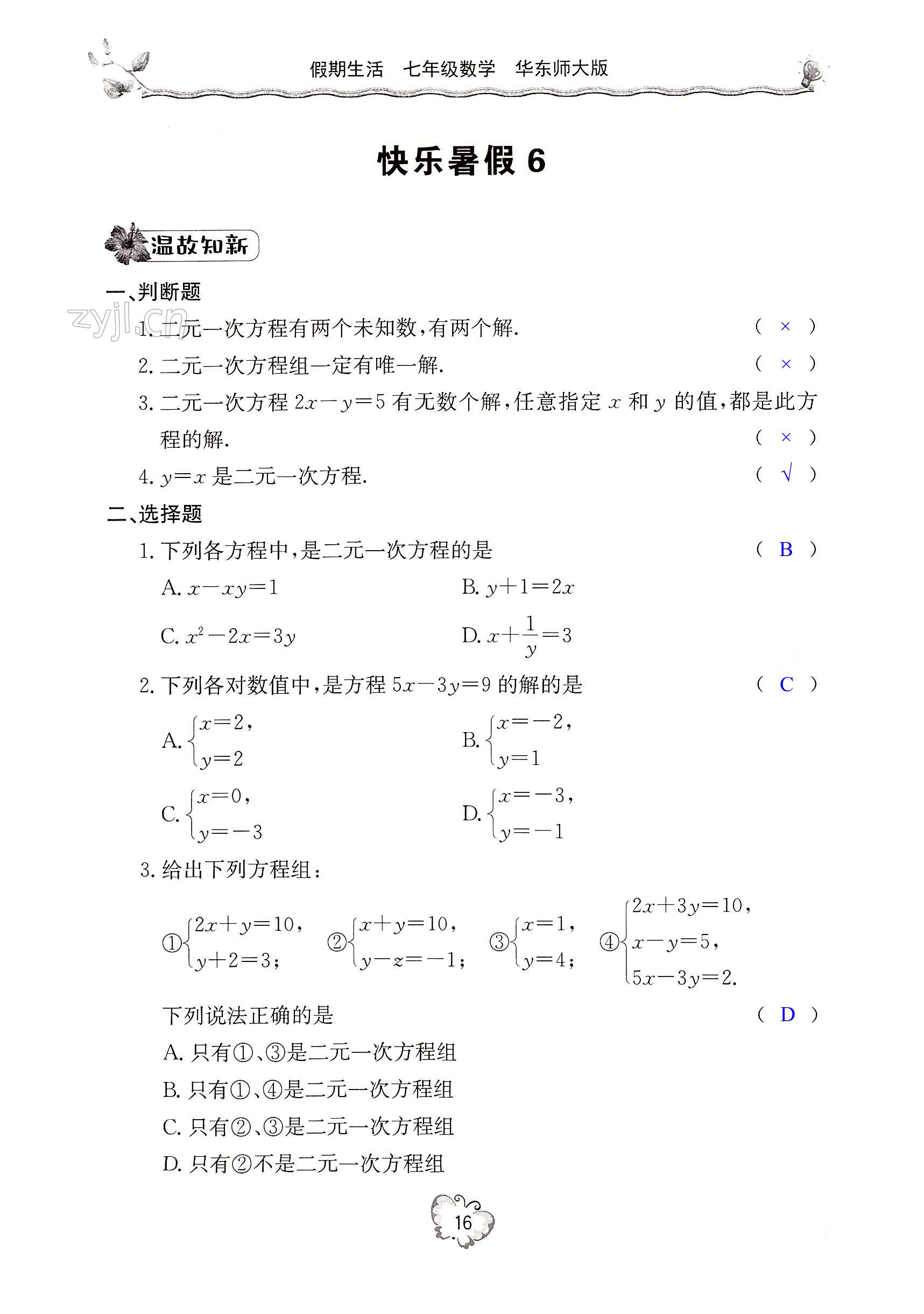 注:目前有些书本章节名称可能整理的还不是很完善,但都是按照顺序排列的,请同学们按照顺序仔细查找。练习册 2022年新课堂假期生活暑假用书七年级数学华师大版 答案主要是用来给同学们做完题方便对答案用的,请勿直接抄袭。