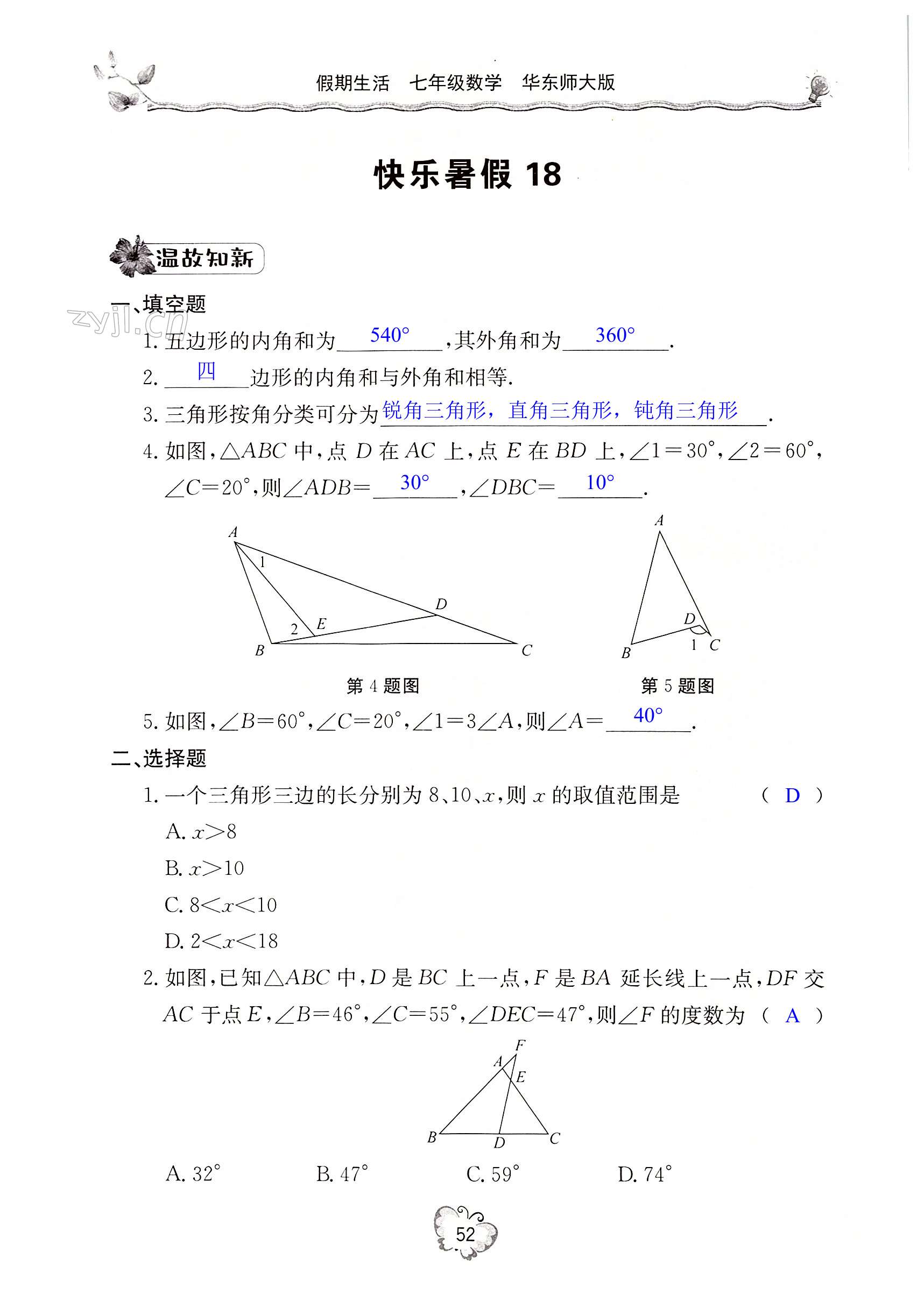 注:目前有些书本章节名称可能整理的还不是很完善,但都是按照顺序排列的,请同学们按照顺序仔细查找。练习册 2022年新课堂假期生活暑假用书七年级数学华师大版 答案主要是用来给同学们做完题方便对答案用的,请勿直接抄袭。