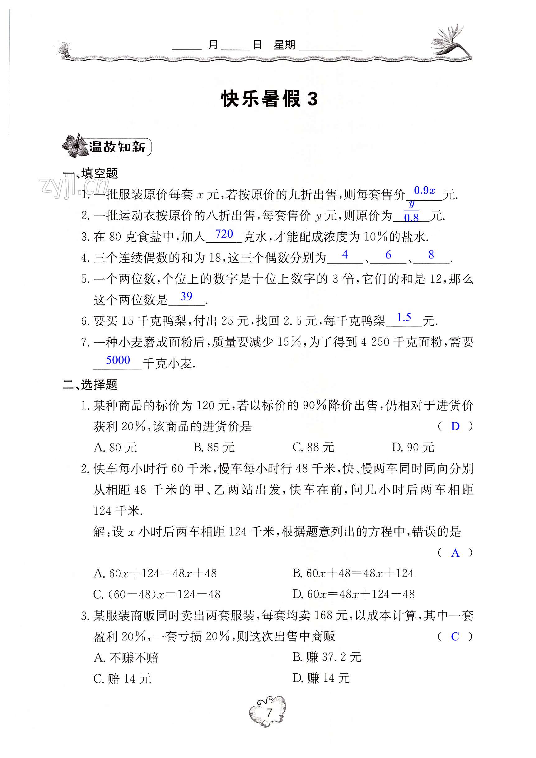 2022年新课堂假期生活暑假用书七年级数学华师大版