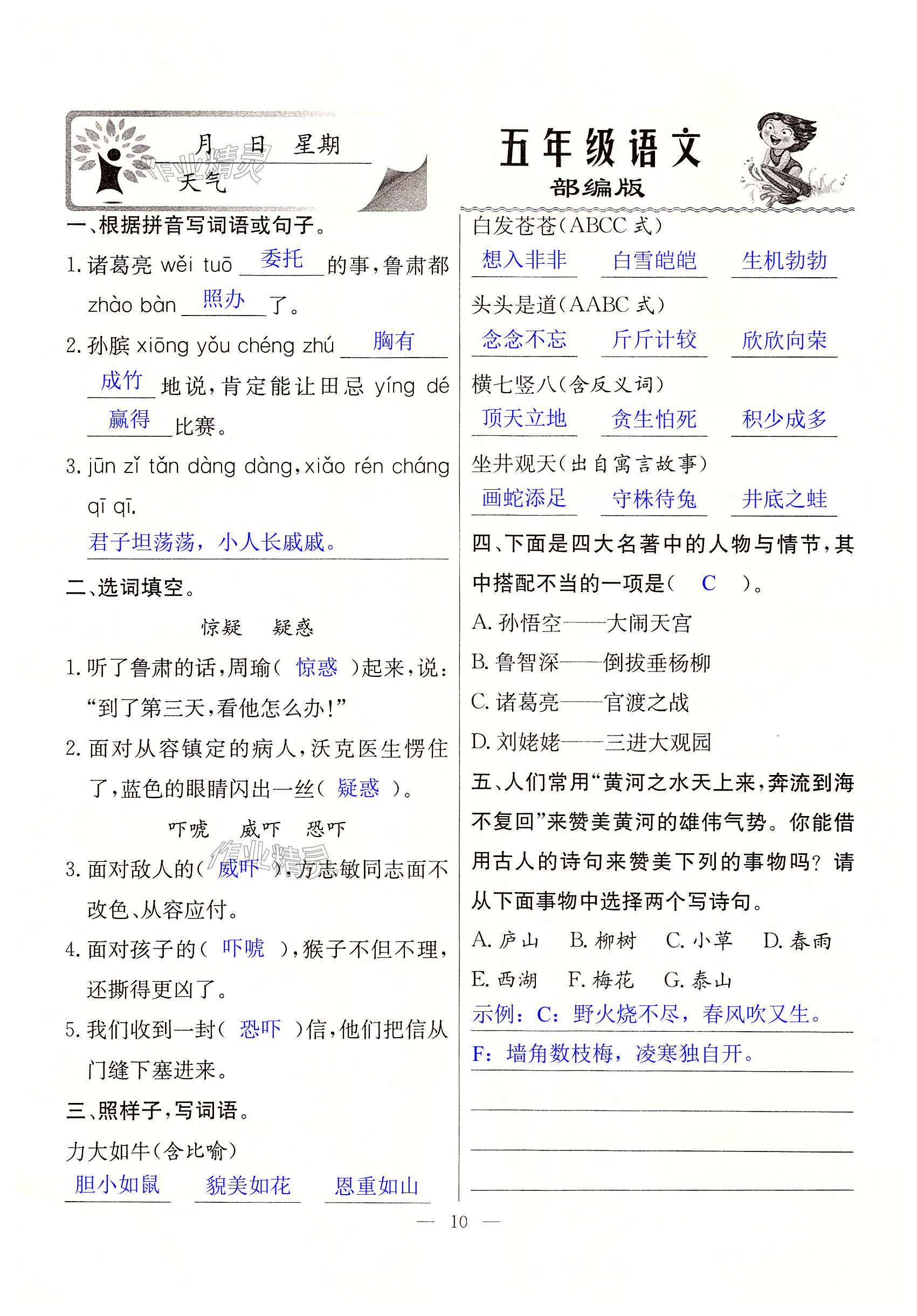 注:目前有些书本章节名称可能整理的还不是很完善,但都是按照顺序排列的,请同学们按照顺序仔细查找。练习册 2022年一诺书业暑假作业快乐假期五年级语文人教版云南美术出版社 答案主要是用来给同学们做完题方便对答案用的,请勿直接抄袭。