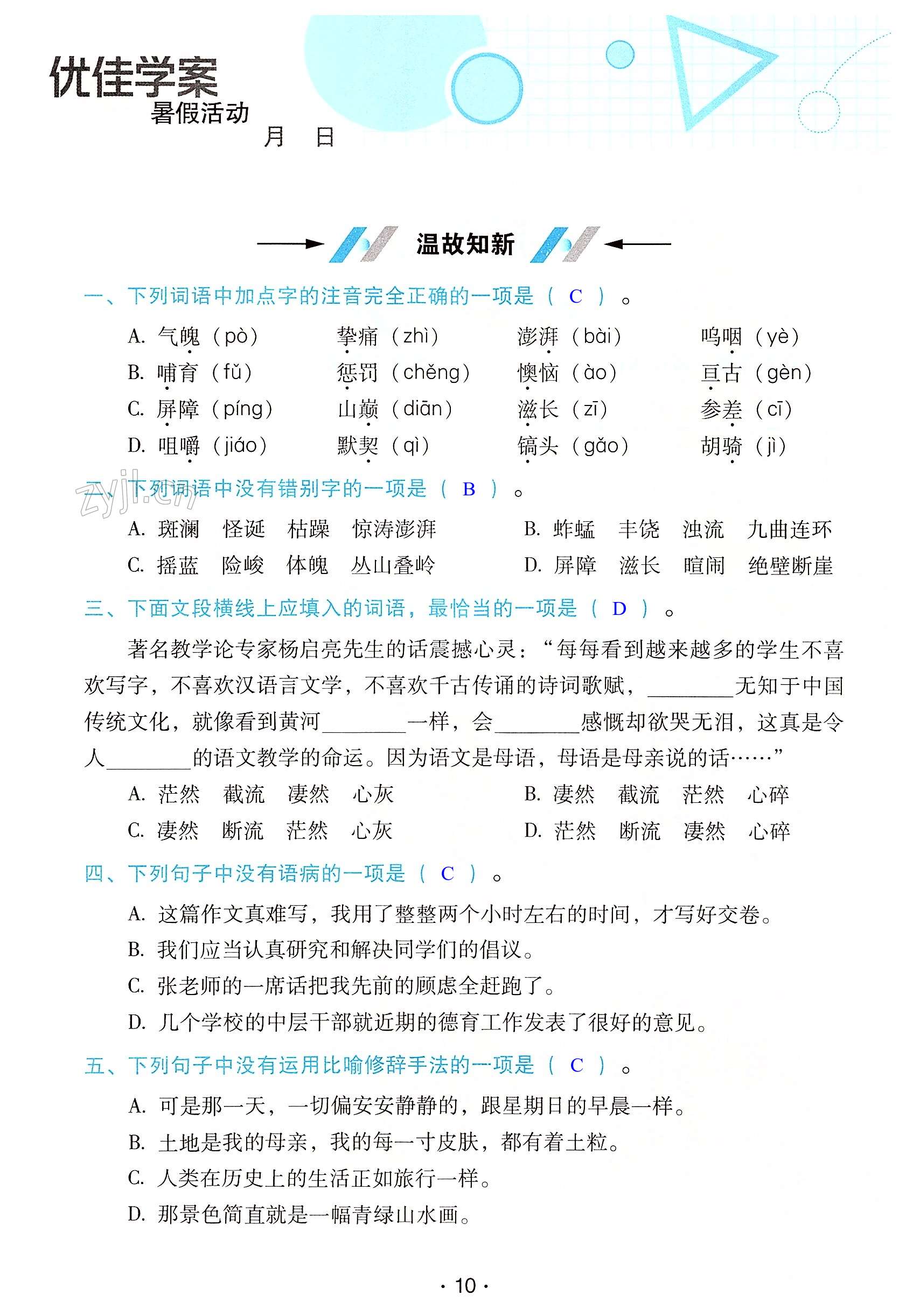 注:目前有些书本章节名称可能整理的还不是很完善,但都是按照顺序排列的,请同学们按照顺序仔细查找。练习册 2022年优佳学案暑假活动七年级语文人教版 答案主要是用来给同学们做完题方便对答案用的,请勿直接抄袭。