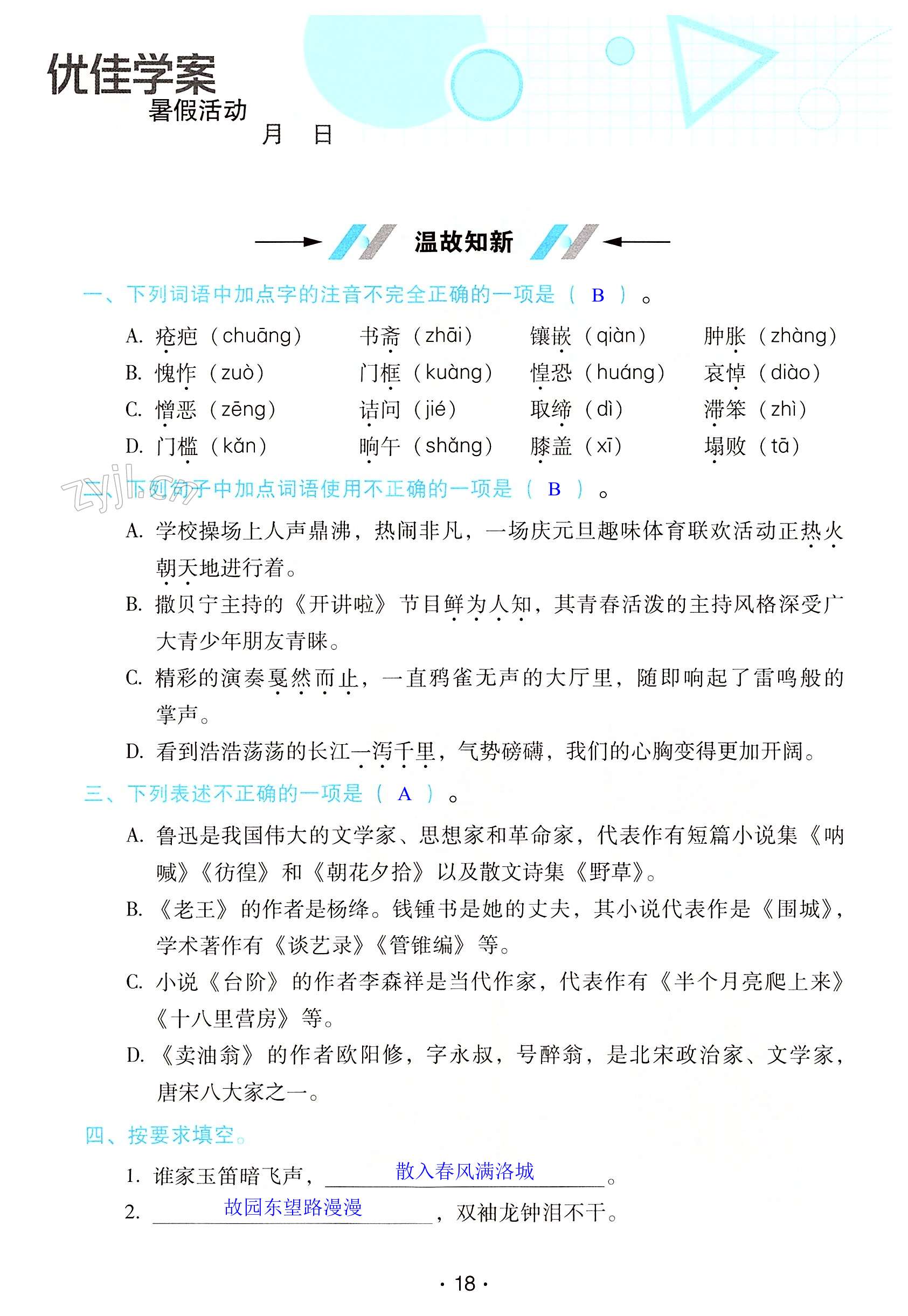 注:目前有些书本章节名称可能整理的还不是很完善,但都是按照顺序排列的,请同学们按照顺序仔细查找。练习册 2022年优佳学案暑假活动七年级语文人教版 答案主要是用来给同学们做完题方便对答案用的,请勿直接抄袭。