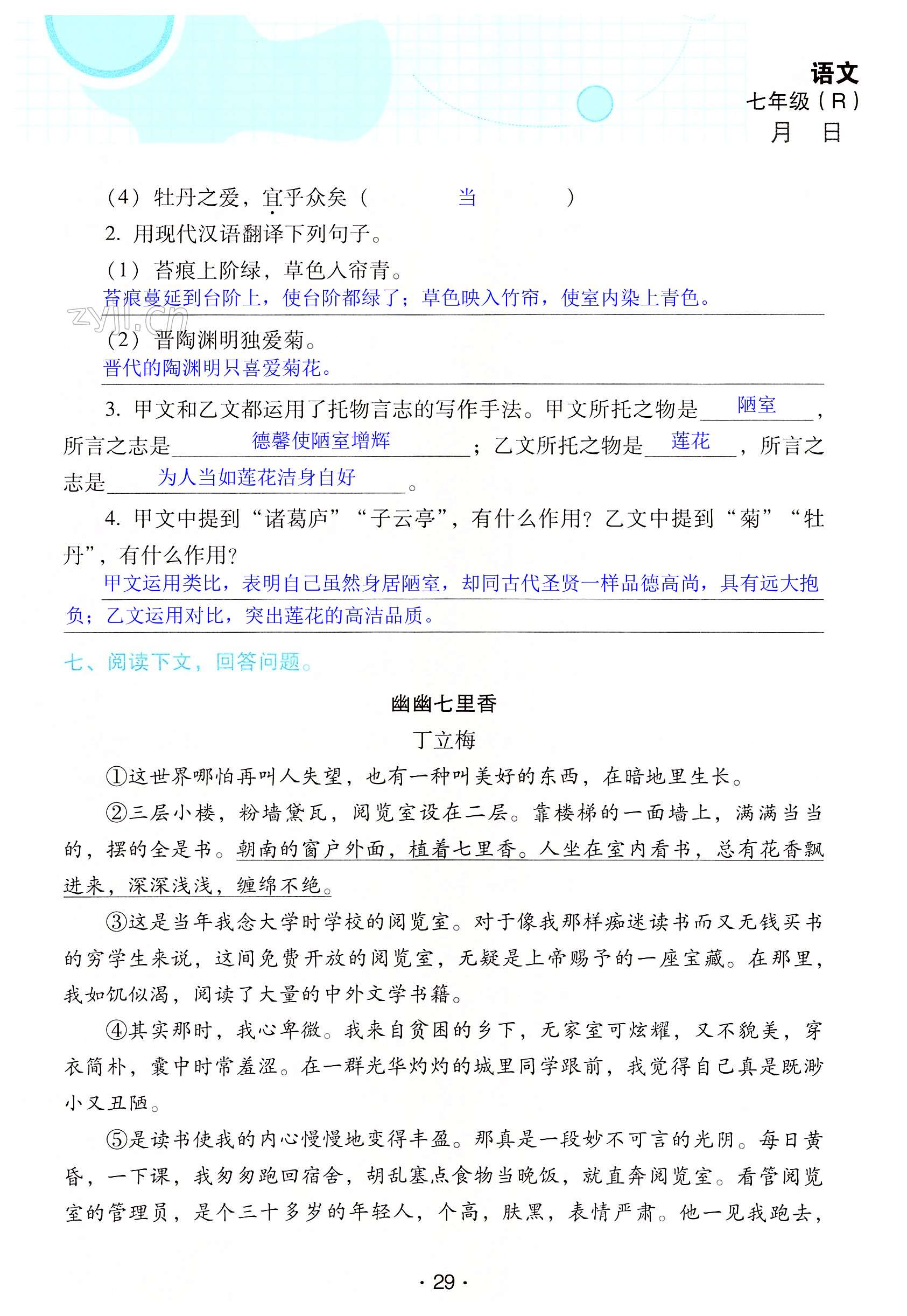 2022年优佳学案暑假活动七年级语文人教版