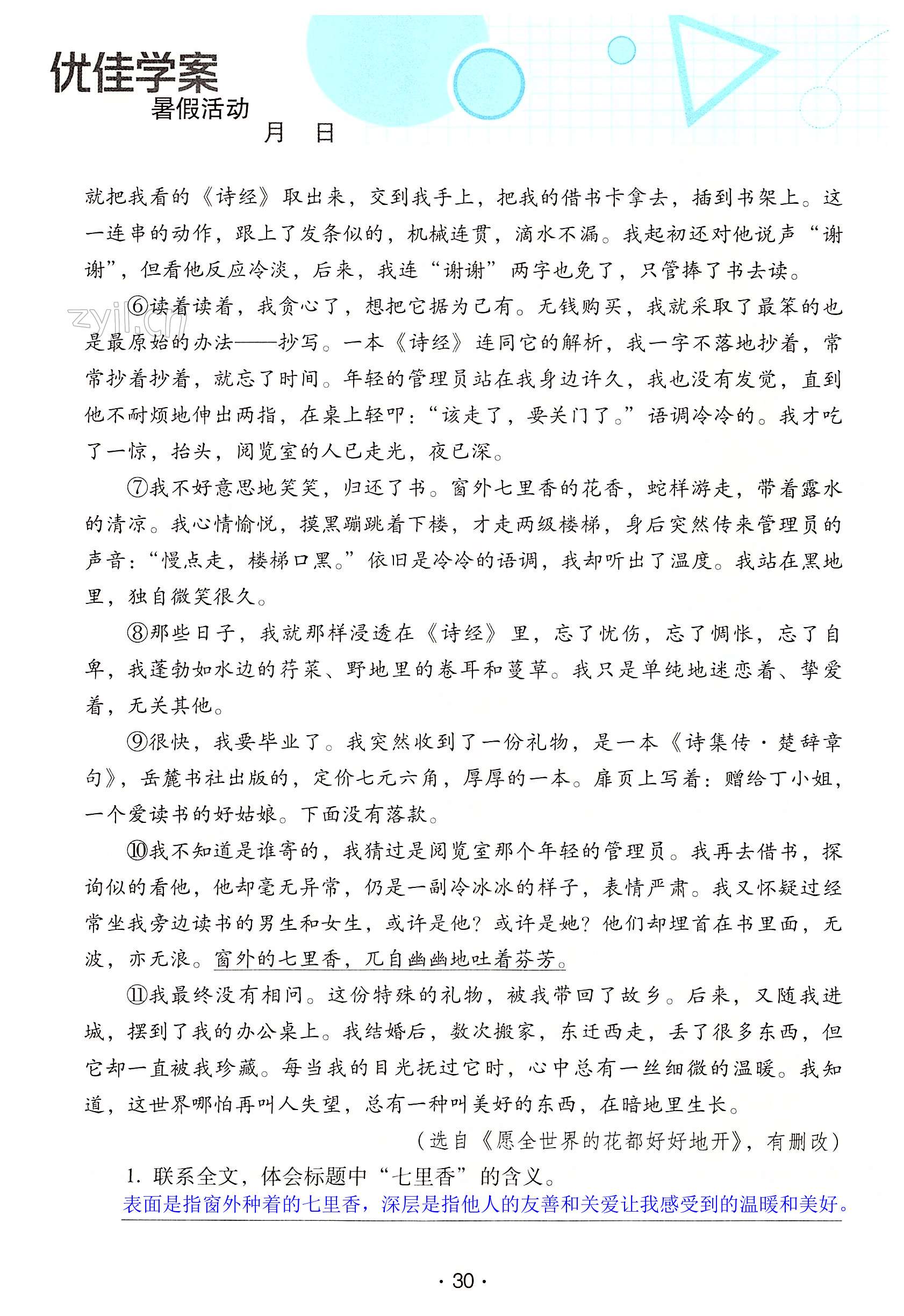 注:目前有些书本章节名称可能整理的还不是很完善,但都是按照顺序排列的,请同学们按照顺序仔细查找。练习册 2022年优佳学案暑假活动七年级语文人教版 答案主要是用来给同学们做完题方便对答案用的,请勿直接抄袭。