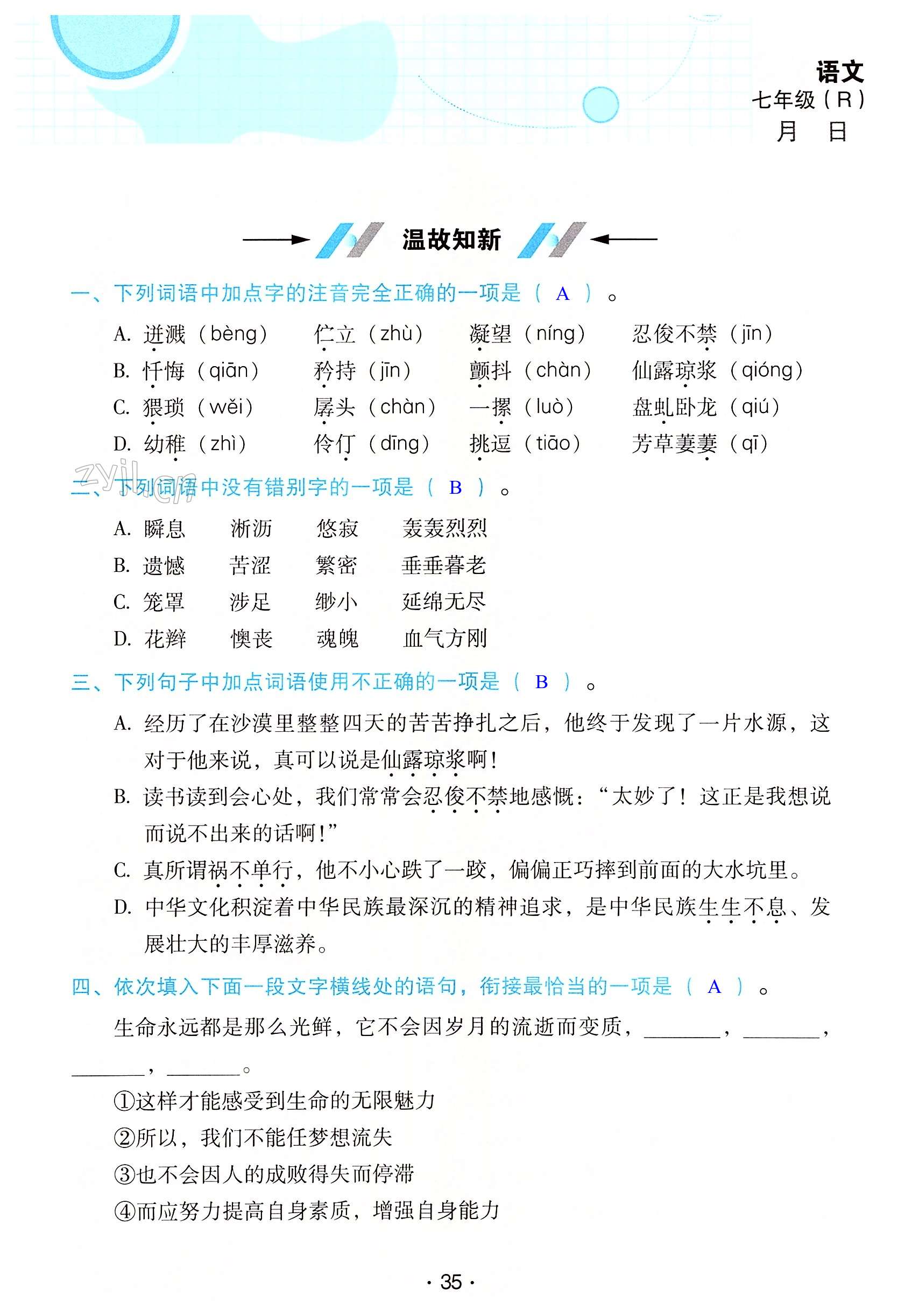 注:目前有些书本章节名称可能整理的还不是很完善,但都是按照顺序排列的,请同学们按照顺序仔细查找。练习册 2022年优佳学案暑假活动七年级语文人教版 答案主要是用来给同学们做完题方便对答案用的,请勿直接抄袭。