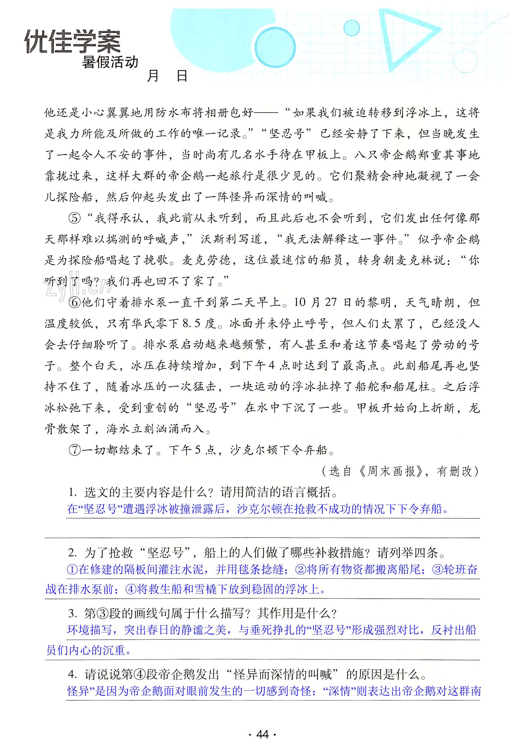 注:目前有些书本章节名称可能整理的还不是很完善,但都是按照顺序排列的,请同学们按照顺序仔细查找。练习册 2022年优佳学案暑假活动七年级语文人教版 答案主要是用来给同学们做完题方便对答案用的,请勿直接抄袭。