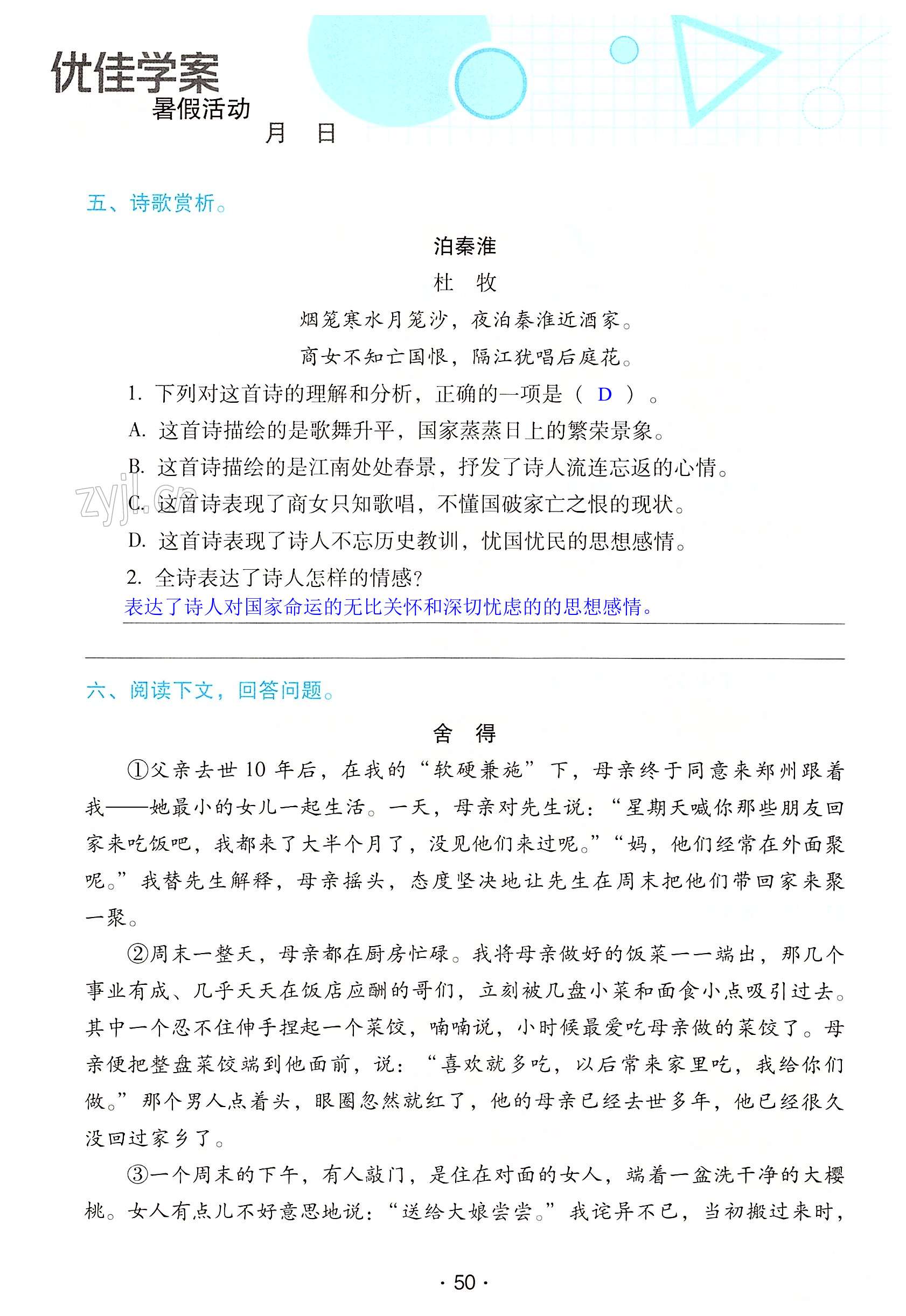 2022年优佳学案暑假活动七年级语文人教版