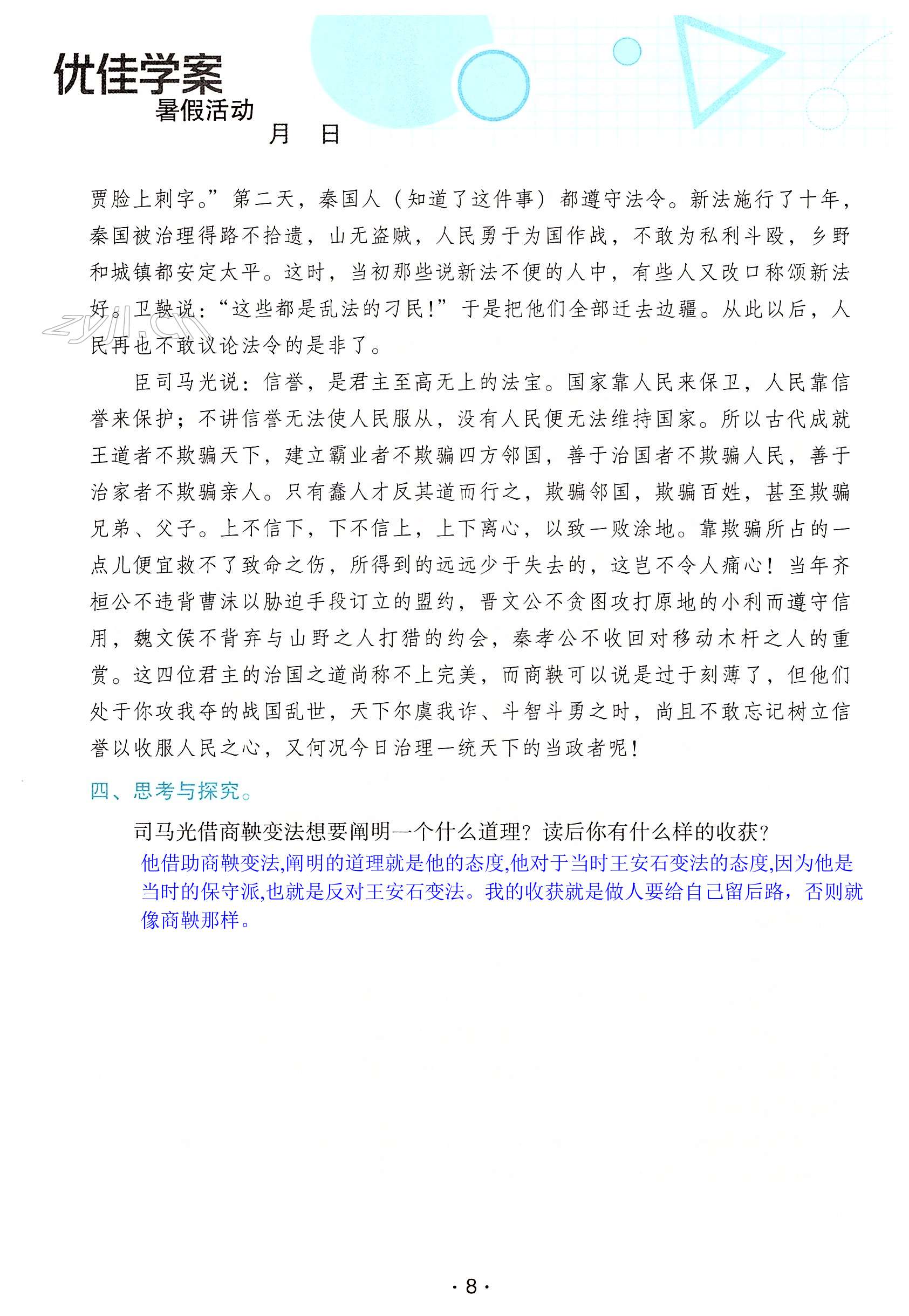 注:目前有些书本章节名称可能整理的还不是很完善,但都是按照顺序排列的,请同学们按照顺序仔细查找。练习册 2022年优佳学案暑假活动七年级语文人教版 答案主要是用来给同学们做完题方便对答案用的,请勿直接抄袭。