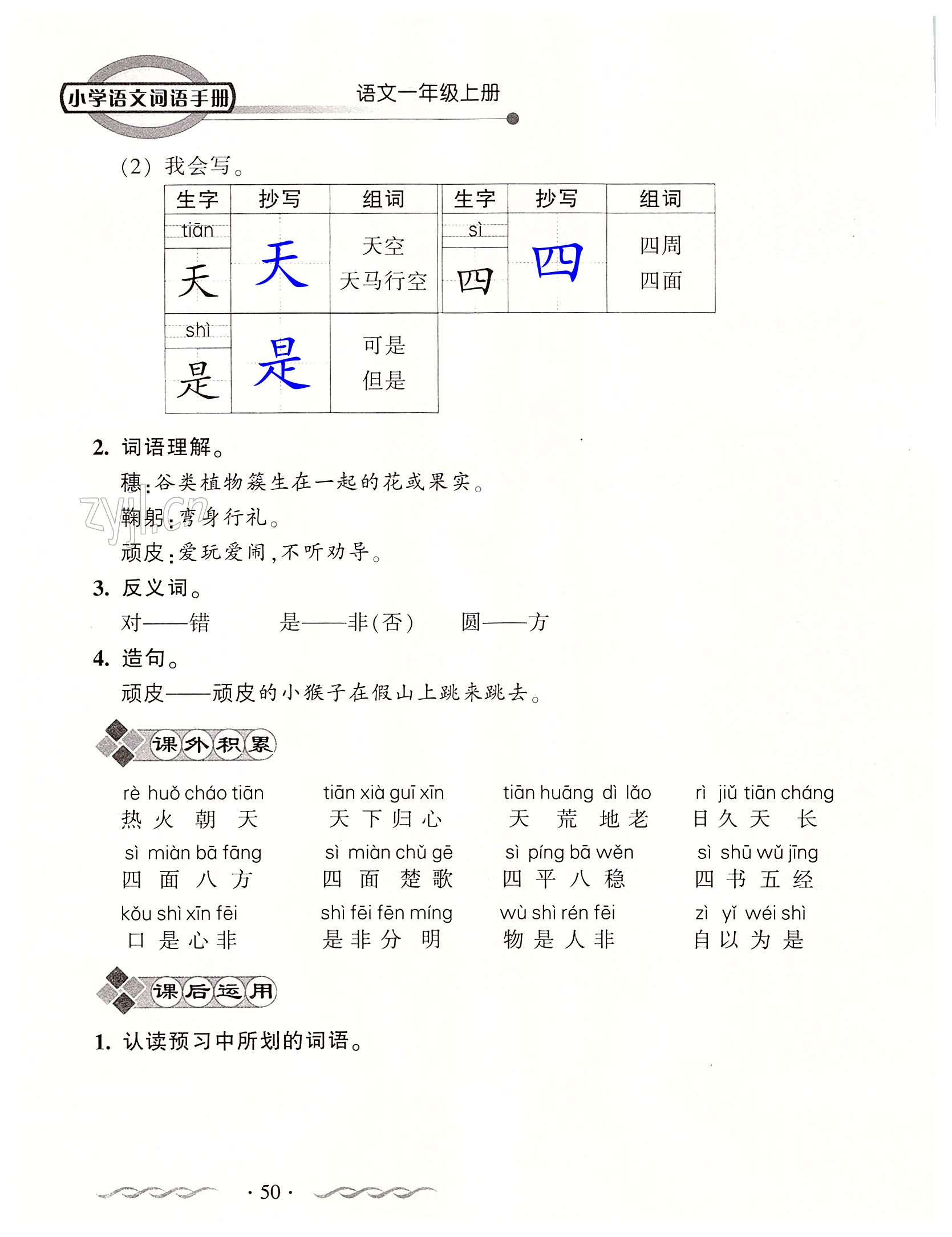 注:目前有些书本章节名称可能整理的还不是很完善,但都是按照顺序排列的,请同学们按照顺序仔细查找。练习册 2022年小学语文词语手册一年级上册人教版开明出版社 答案主要是用来给同学们做完题方便对答案用的,请勿直接抄袭。