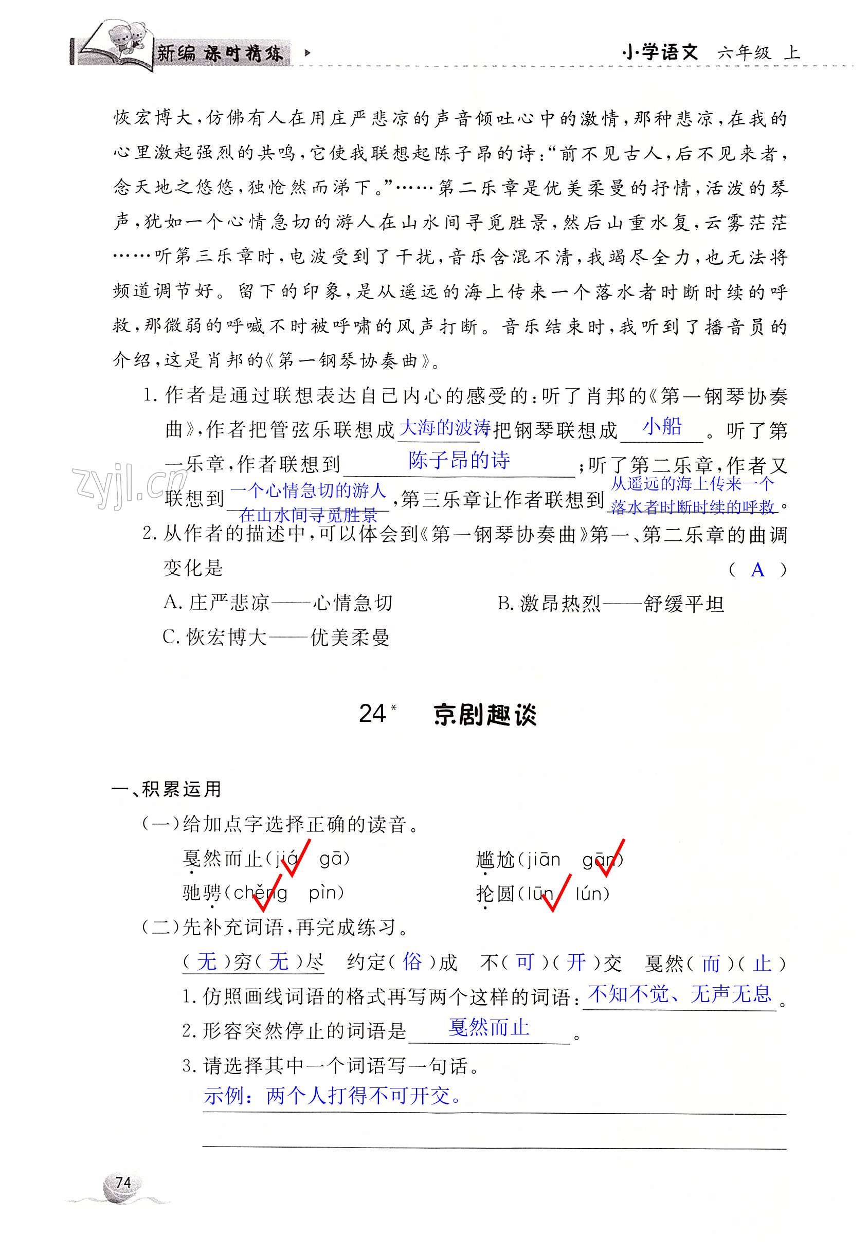 注:目前有些书本章节名称可能整理的还不是很完善,但都是按照顺序排列的,请同学们按照顺序仔细查找。练习册 2022年新编课时精练六年级语文上册人教版 答案主要是用来给同学们做完题方便对答案用的,请勿直接抄袭。