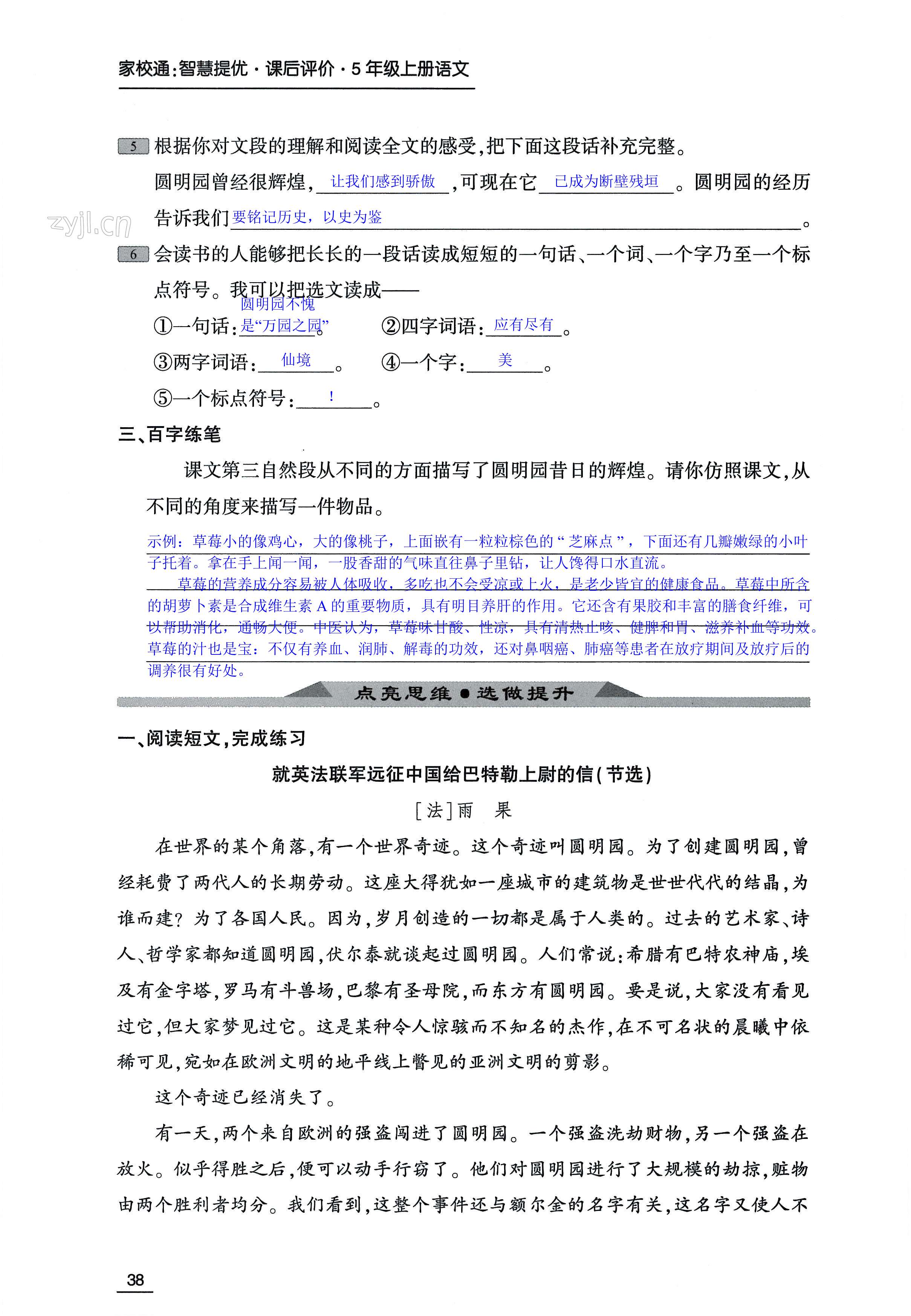 2022年家校通智慧提优课后评价五年级语文上册人教版