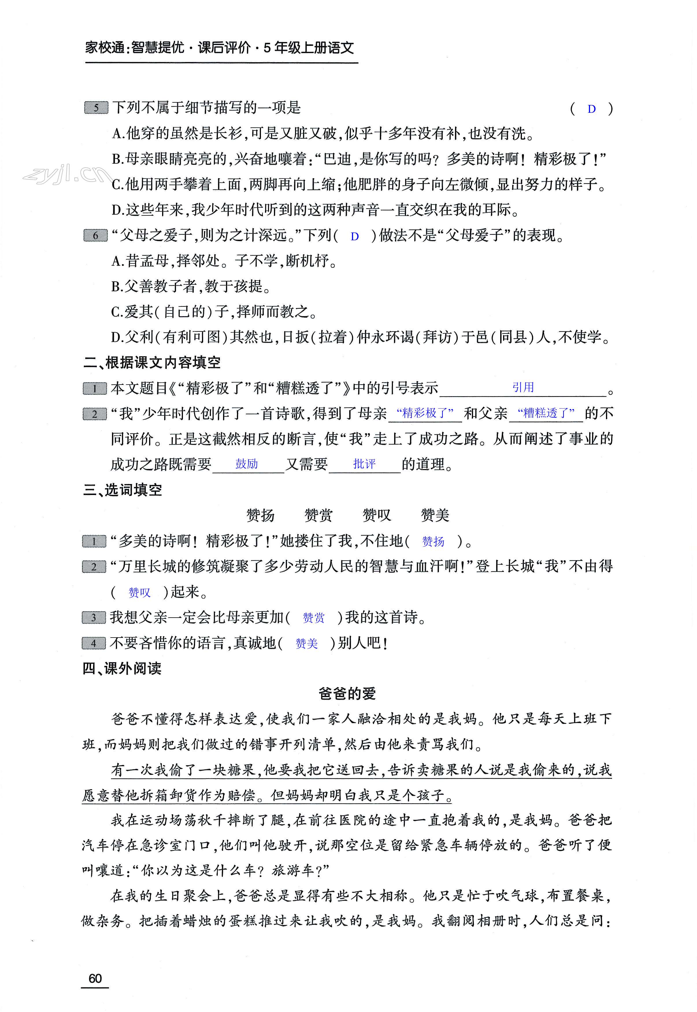 2022年家校通智慧提优课后评价五年级语文上册人教版