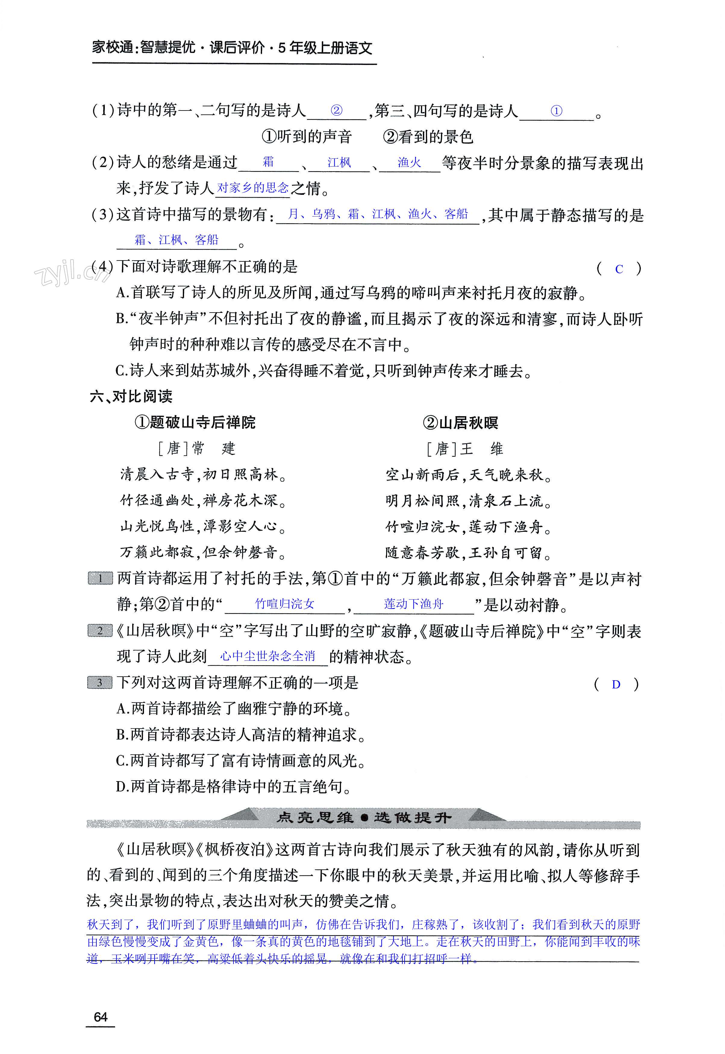 注:目前有些书本章节名称可能整理的还不是很完善,但都是按照顺序排列的,请同学们按照顺序仔细查找。练习册 2022年家校通智慧提优课后评价五年级语文上册人教版 答案主要是用来给同学们做完题方便对答案用的,请勿直接抄袭。