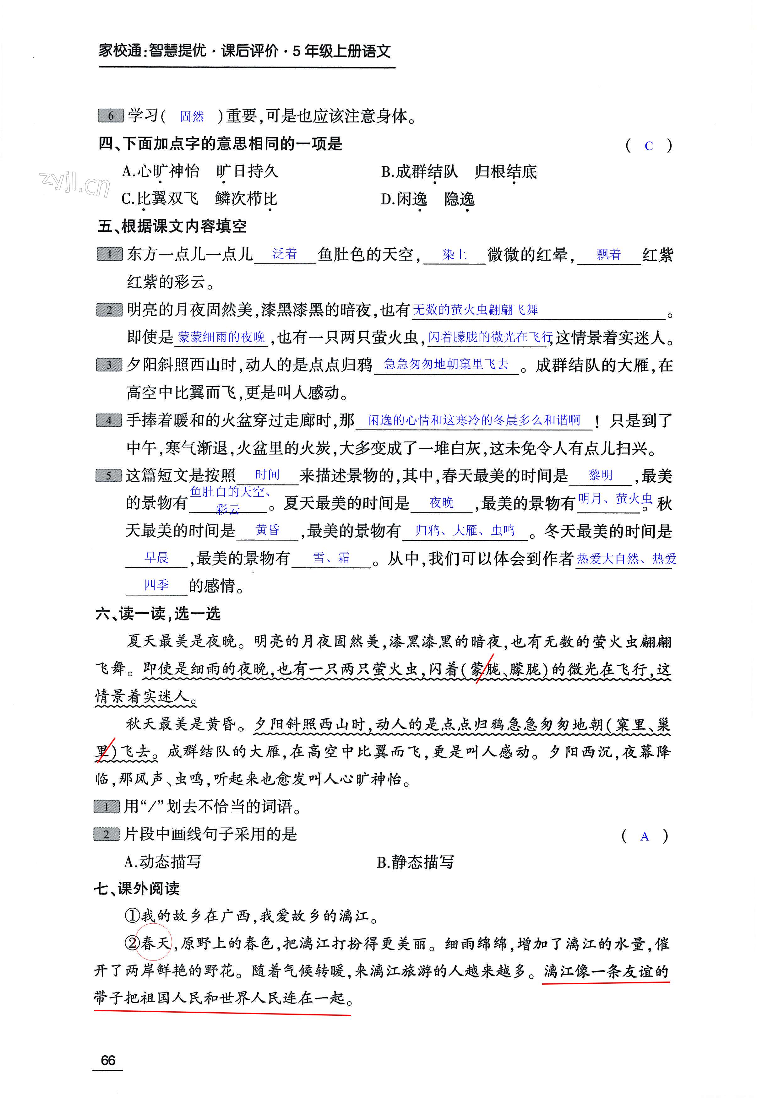 注:目前有些书本章节名称可能整理的还不是很完善,但都是按照顺序排列的,请同学们按照顺序仔细查找。练习册 2022年家校通智慧提优课后评价五年级语文上册人教版 答案主要是用来给同学们做完题方便对答案用的,请勿直接抄袭。