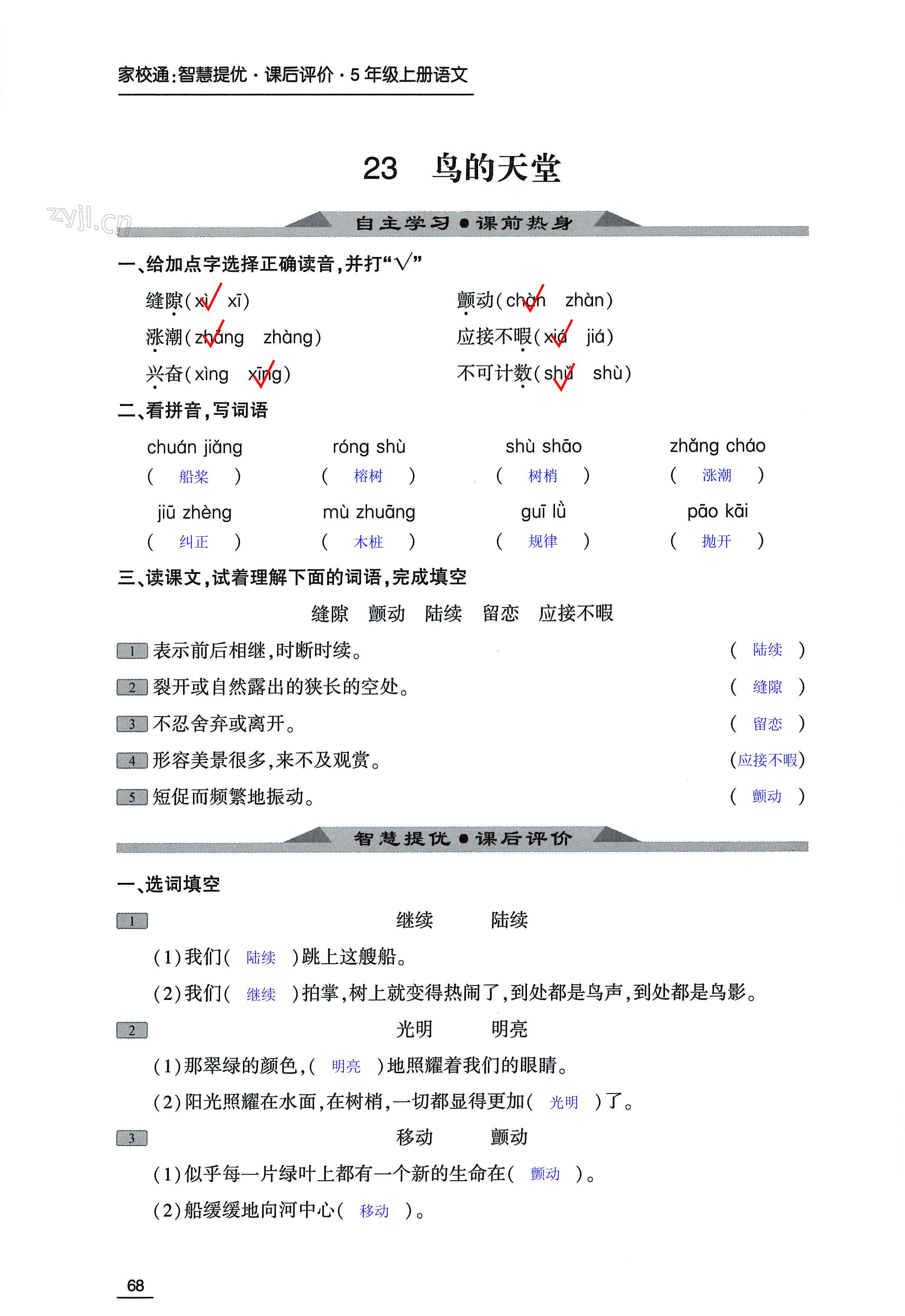 注:目前有些书本章节名称可能整理的还不是很完善,但都是按照顺序排列的,请同学们按照顺序仔细查找。练习册 2022年家校通智慧提优课后评价五年级语文上册人教版 答案主要是用来给同学们做完题方便对答案用的,请勿直接抄袭。
