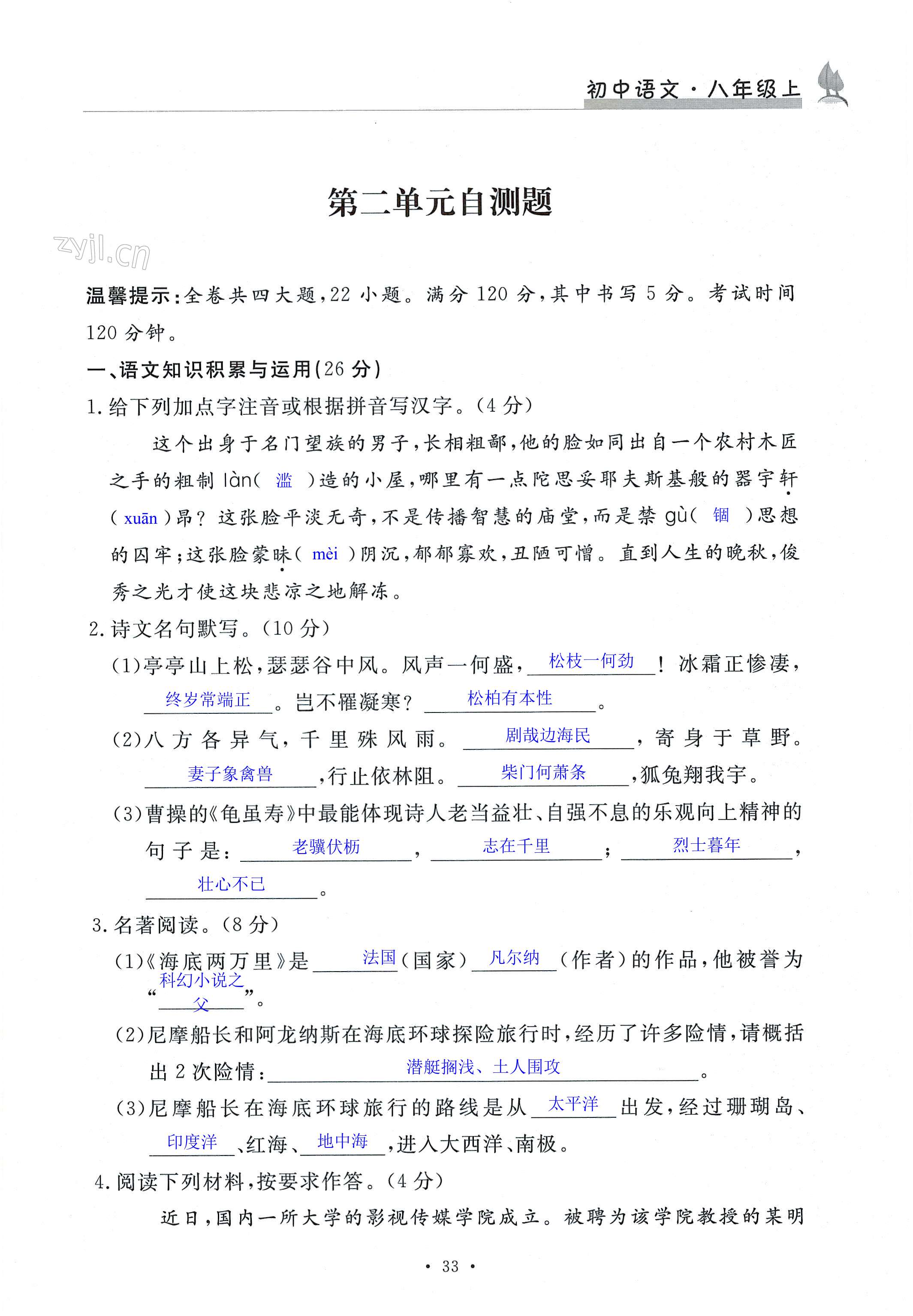 注:目前有些书本章节名称可能整理的还不是很完善,但都是按照顺序排列的,请同学们按照顺序仔细查找。练习册 2022年课时精练八年级语文上册人教版 答案主要是用来给同学们做完题方便对答案用的,请勿直接抄袭。