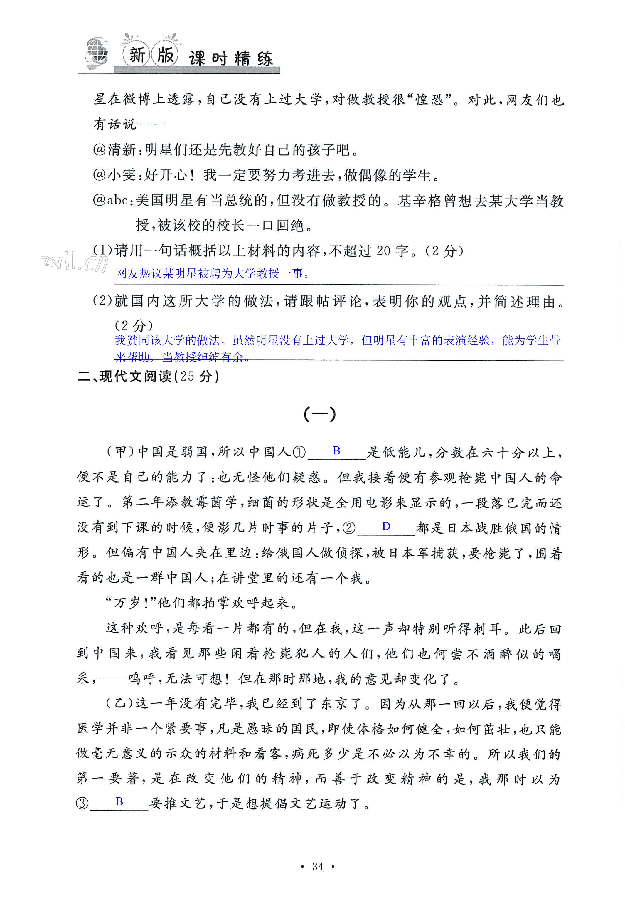 注:目前有些书本章节名称可能整理的还不是很完善,但都是按照顺序排列的,请同学们按照顺序仔细查找。练习册 2022年课时精练八年级语文上册人教版 答案主要是用来给同学们做完题方便对答案用的,请勿直接抄袭。