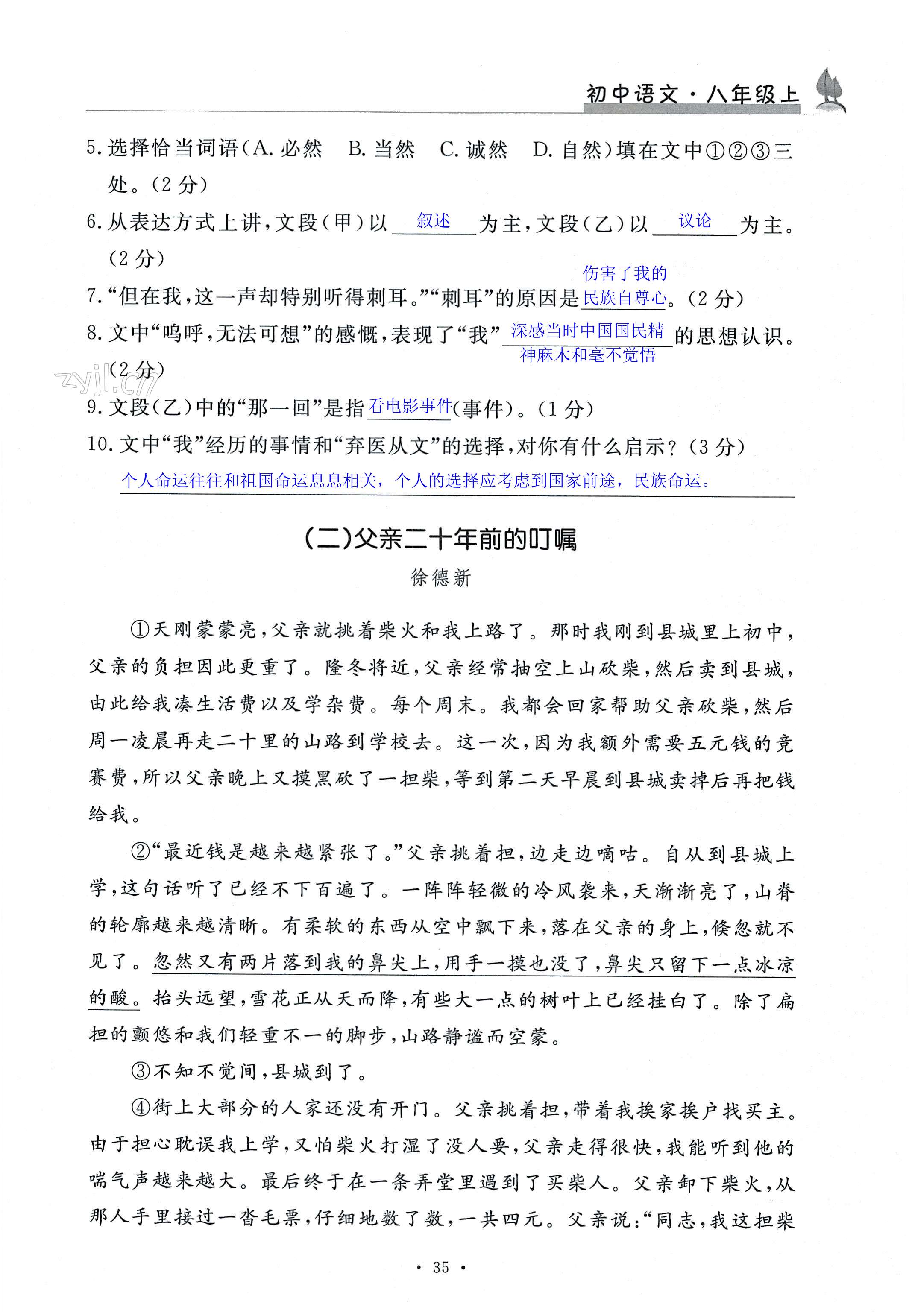 注:目前有些书本章节名称可能整理的还不是很完善,但都是按照顺序排列的,请同学们按照顺序仔细查找。练习册 2022年课时精练八年级语文上册人教版 答案主要是用来给同学们做完题方便对答案用的,请勿直接抄袭。