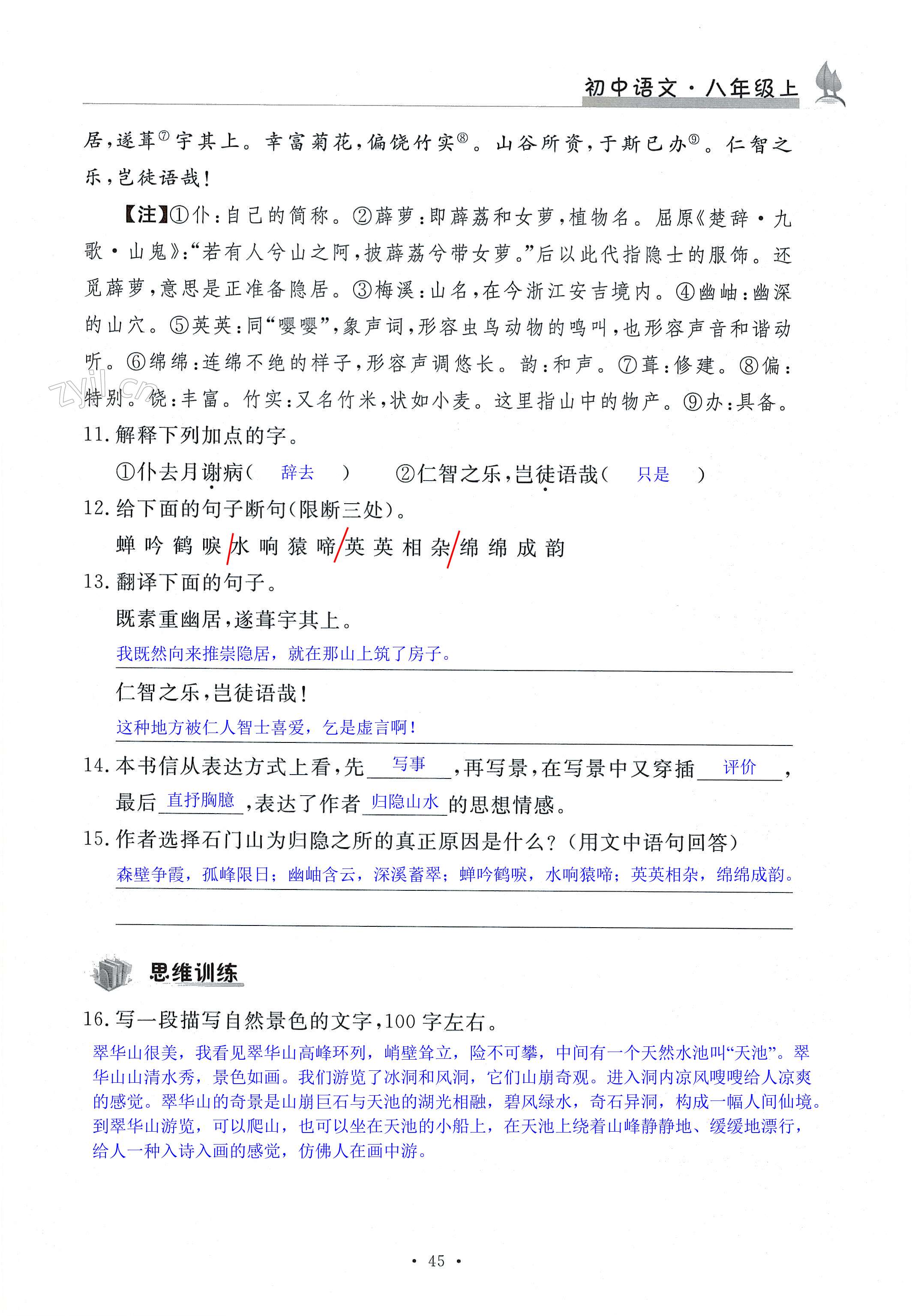 注:目前有些书本章节名称可能整理的还不是很完善,但都是按照顺序排列的,请同学们按照顺序仔细查找。练习册 2022年课时精练八年级语文上册人教版 答案主要是用来给同学们做完题方便对答案用的,请勿直接抄袭。