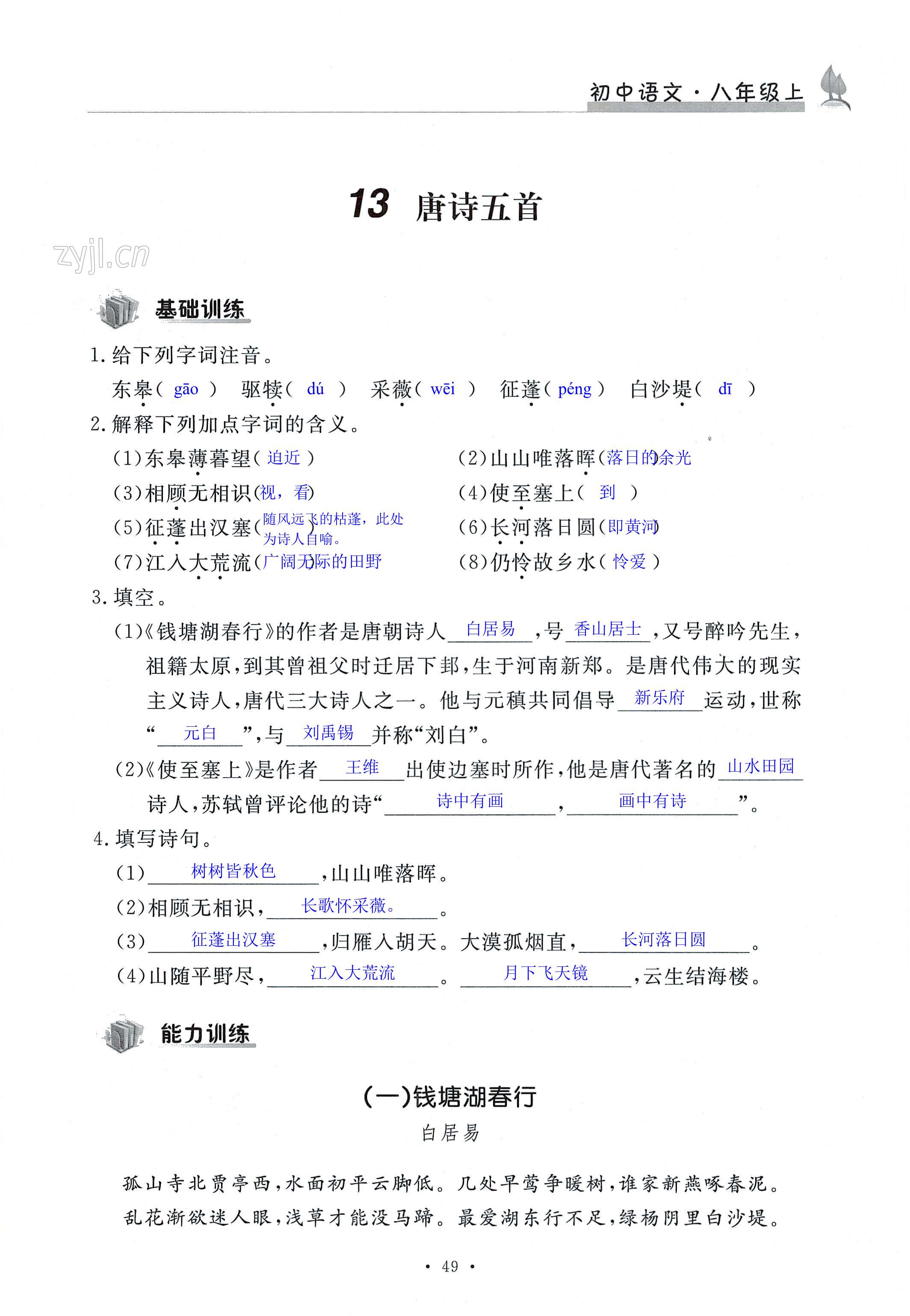 注:目前有些书本章节名称可能整理的还不是很完善,但都是按照顺序排列的,请同学们按照顺序仔细查找。练习册 2022年课时精练八年级语文上册人教版 答案主要是用来给同学们做完题方便对答案用的,请勿直接抄袭。